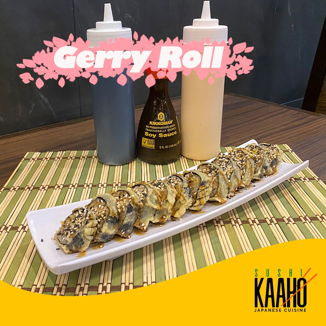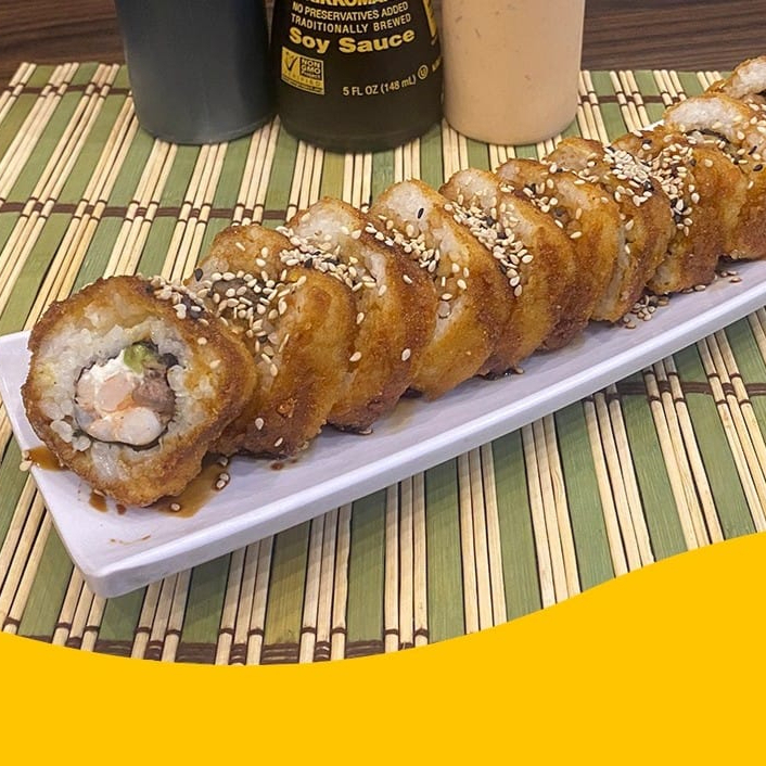 Arroz frito, camarones capeados, philadelphia y aguacate por dentro, capeado con salsa de anguila y ajonjoli