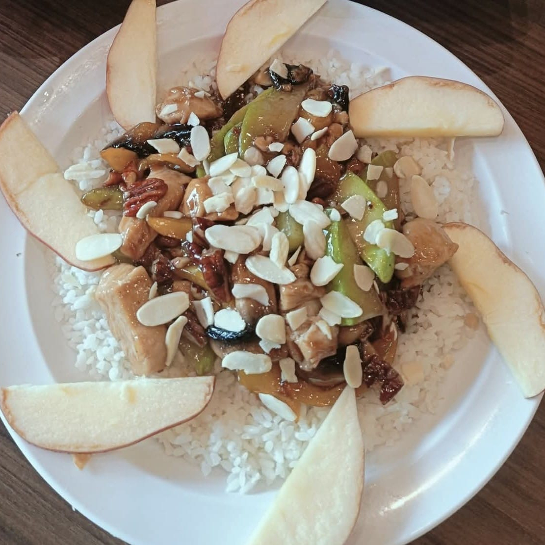 cubos de pollo con verduras seleccionadas bañadas en salsa de almendras y nuez con cama de arroz al vapor