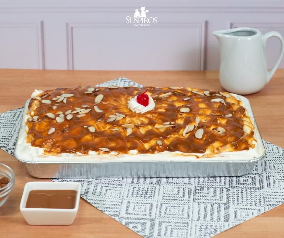 Pastel de vainilla reposado en 4 leches con yogurth natural cubierto con crema suspiros ,cajeta coronado ,almendras y una