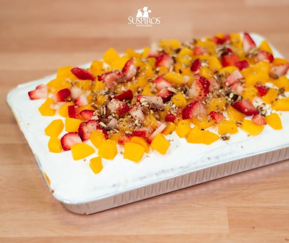 Pan vainilla reposado en 3leches cubierta crema suspiros decorado con durazno y cereza con nuez picada