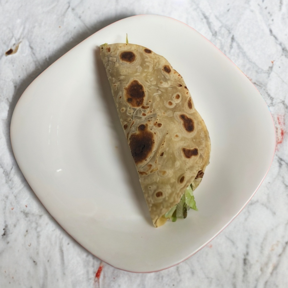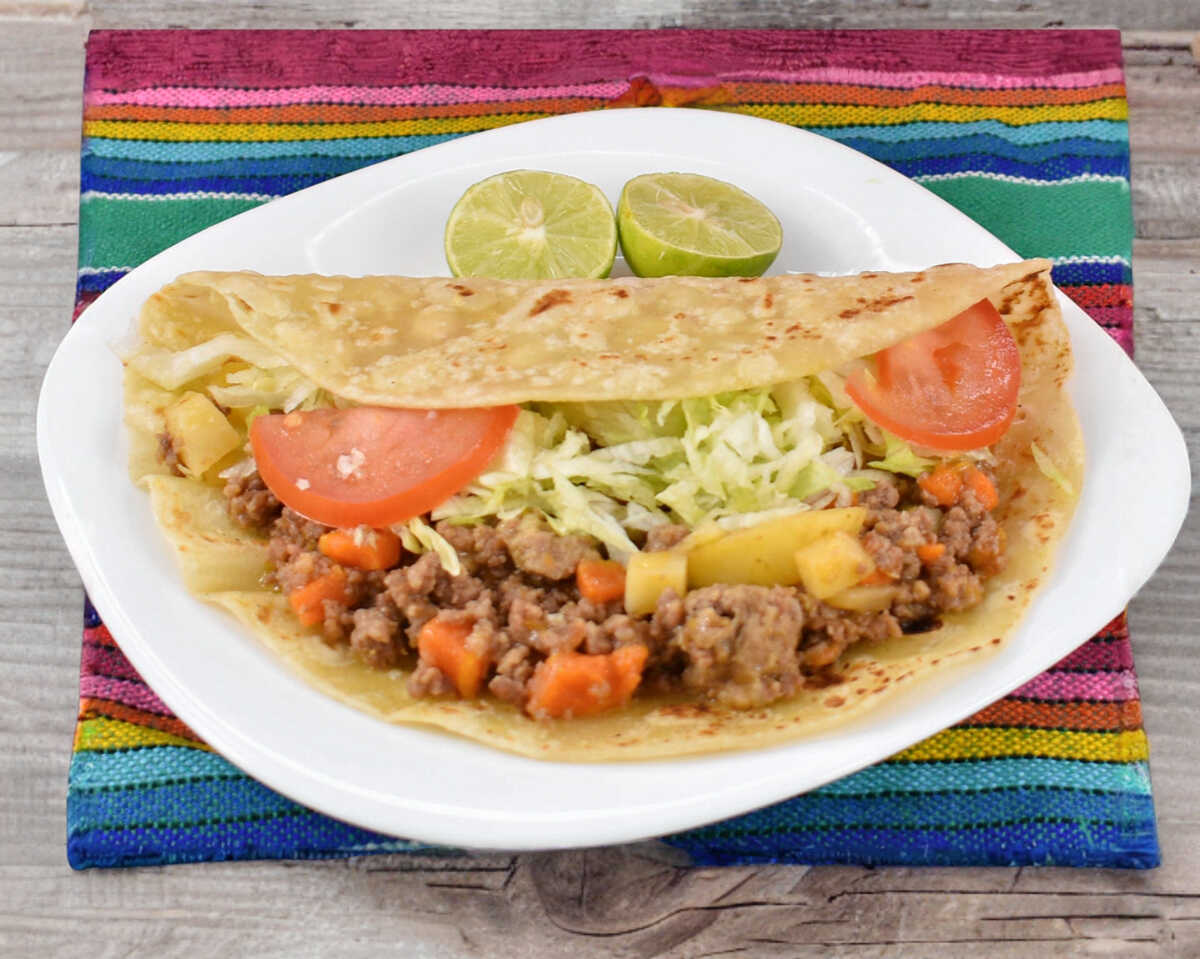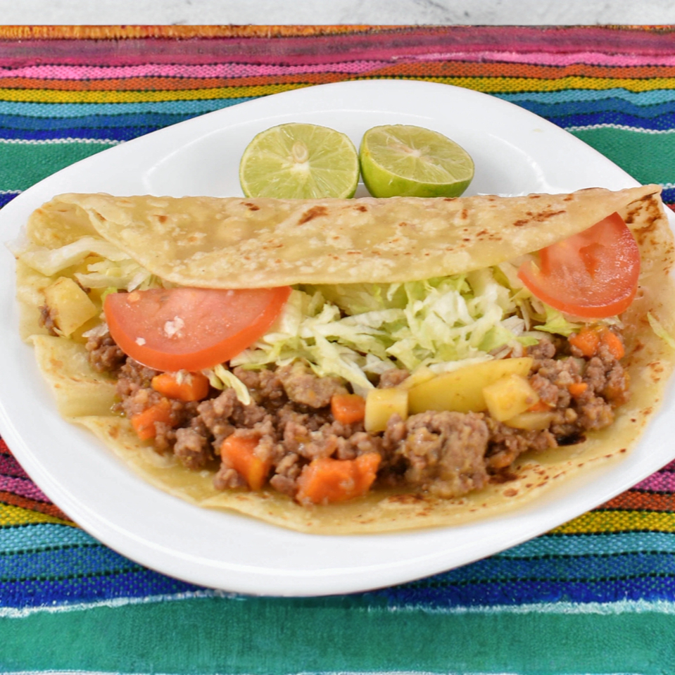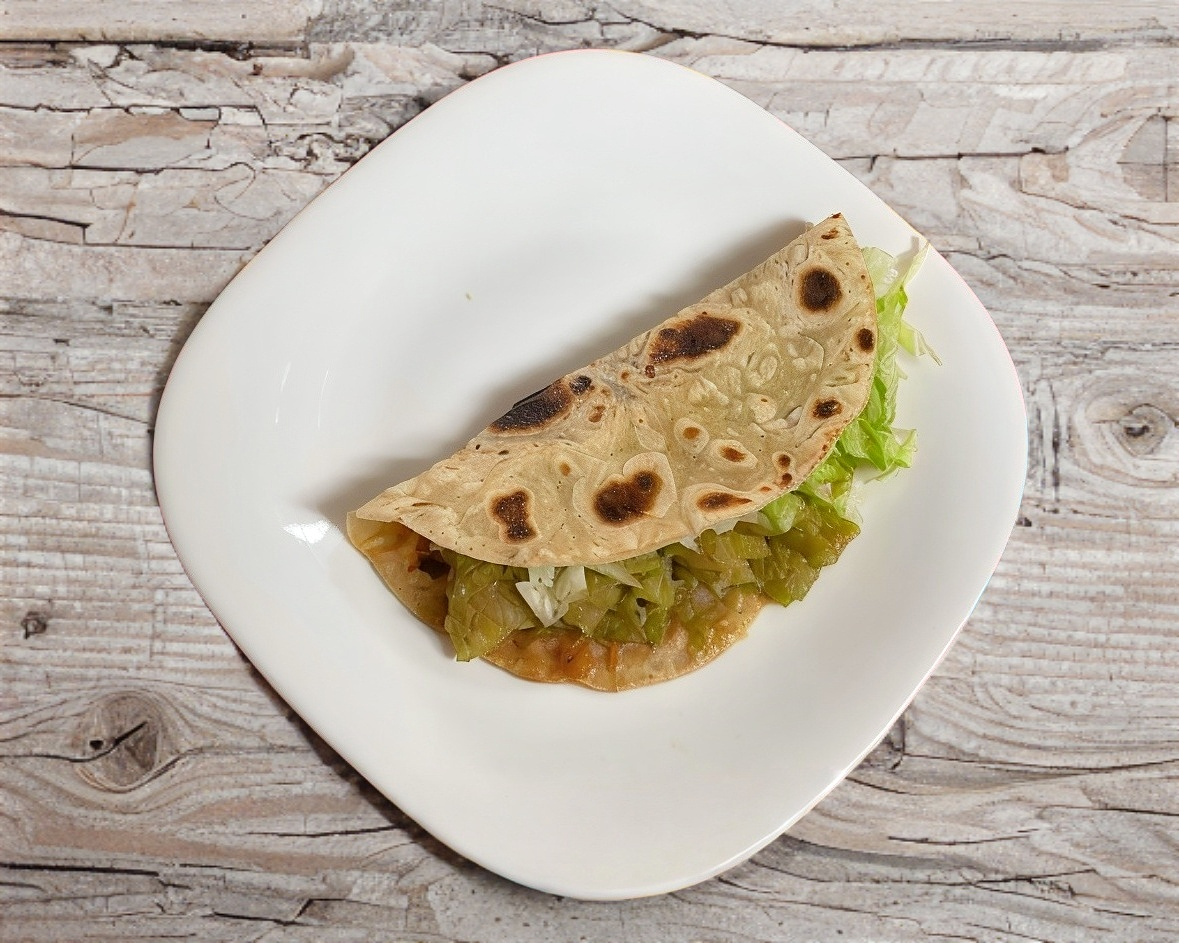 Taco de Harina de maiz (Elige Tu Guiso), frijoles, lechuga y salsa de la casa. (Personal)