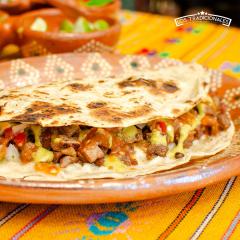 Lleva mantequilla, crema, queso amarillo, queso asadero y carne asada de res 150 g, las verduras chile, tomate y cebolla y complementos van aparte, salsa de chile jalapeño y salsa de tomate.