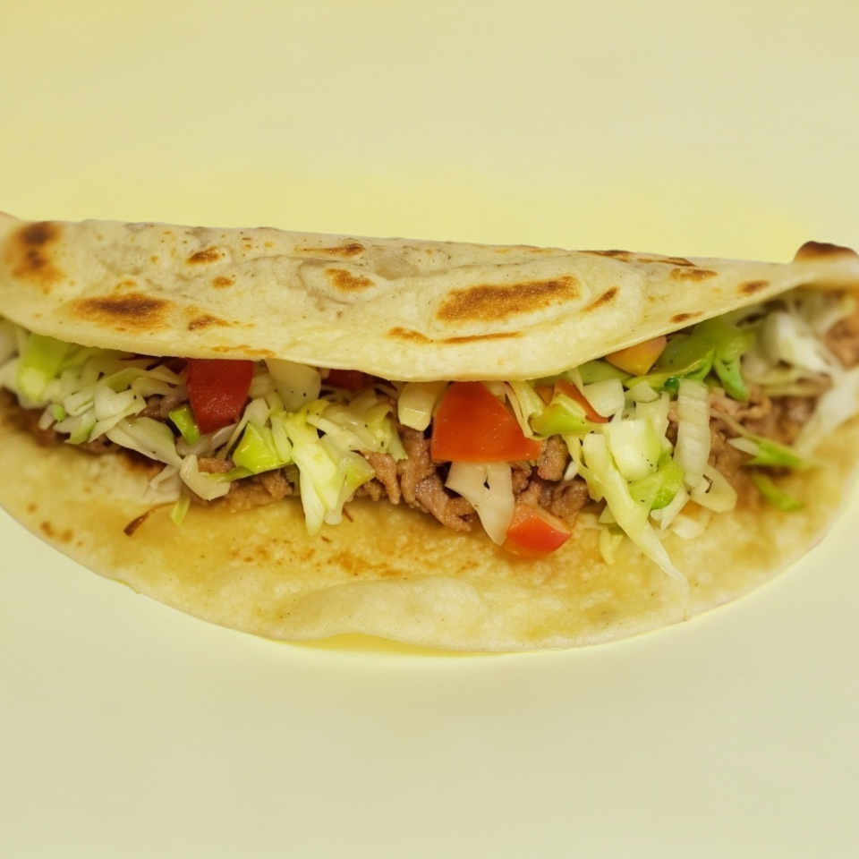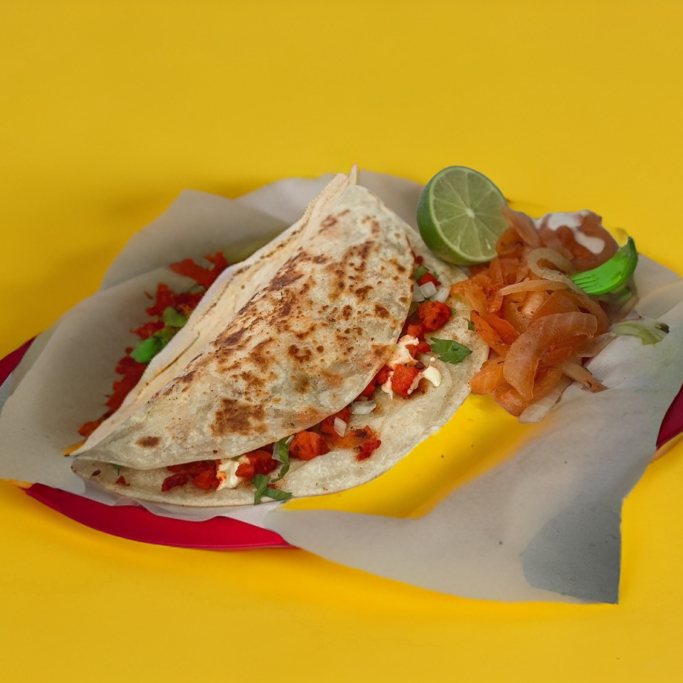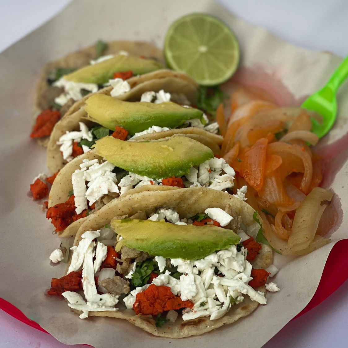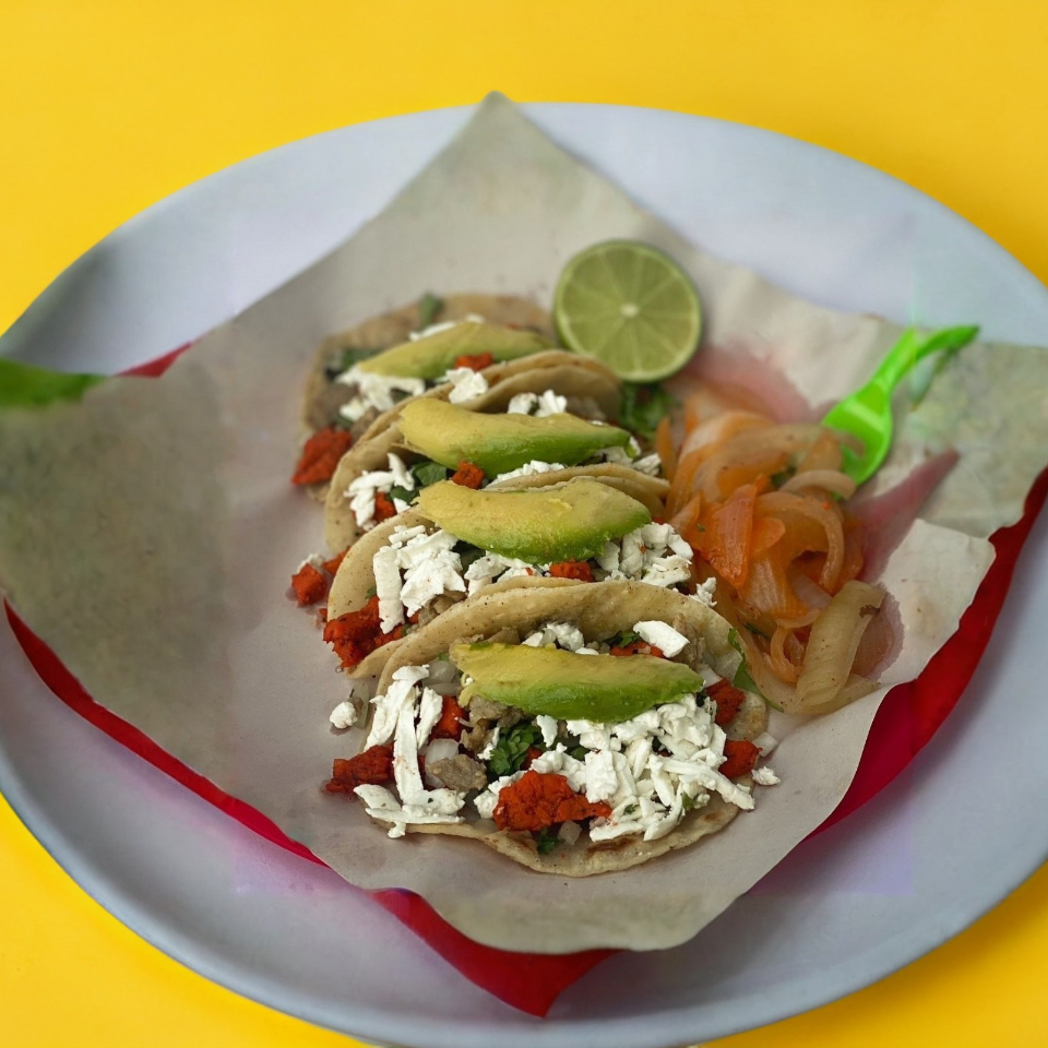 Tortilla doble, Bistec, Pastor, cebolla asada, cilantro, queso, aguacate y cebolla asada.