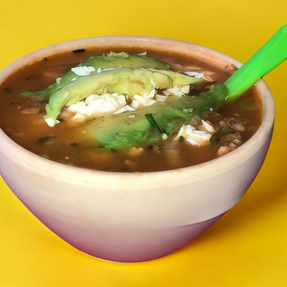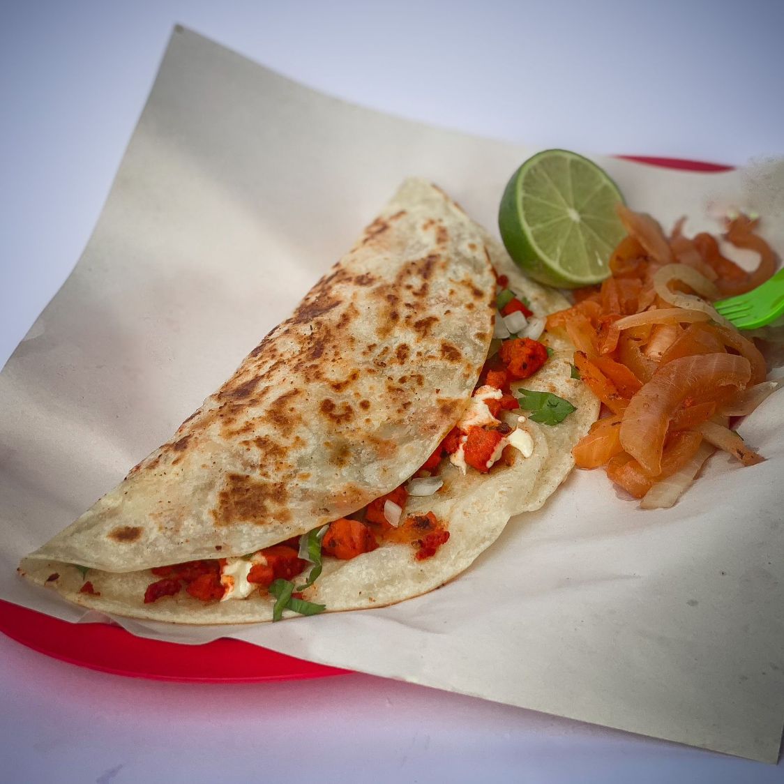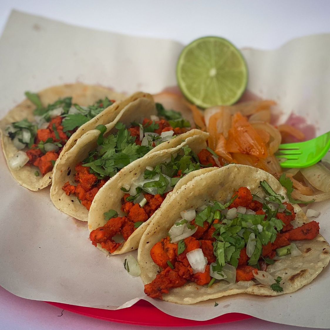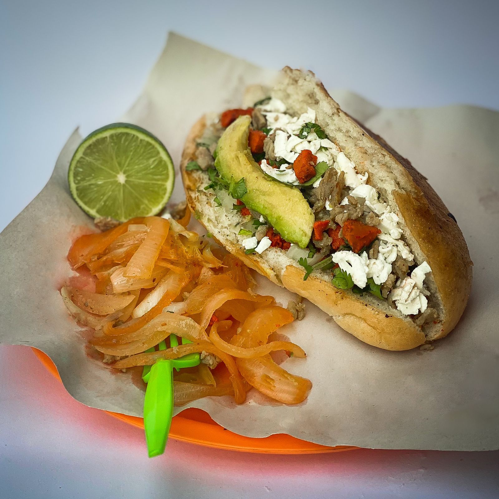 Tortilla doble, Bistec, Pastor, cebolla asada, cilantro, queso, aguacate y cebolla asada.