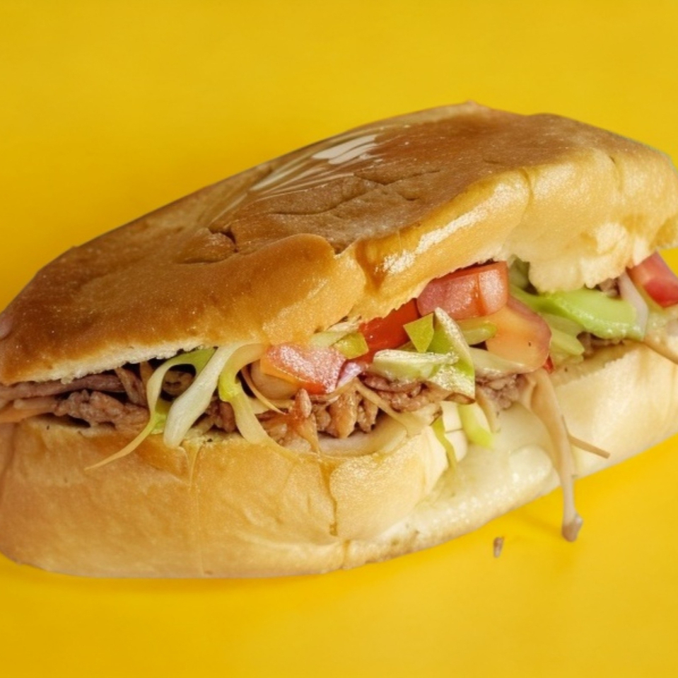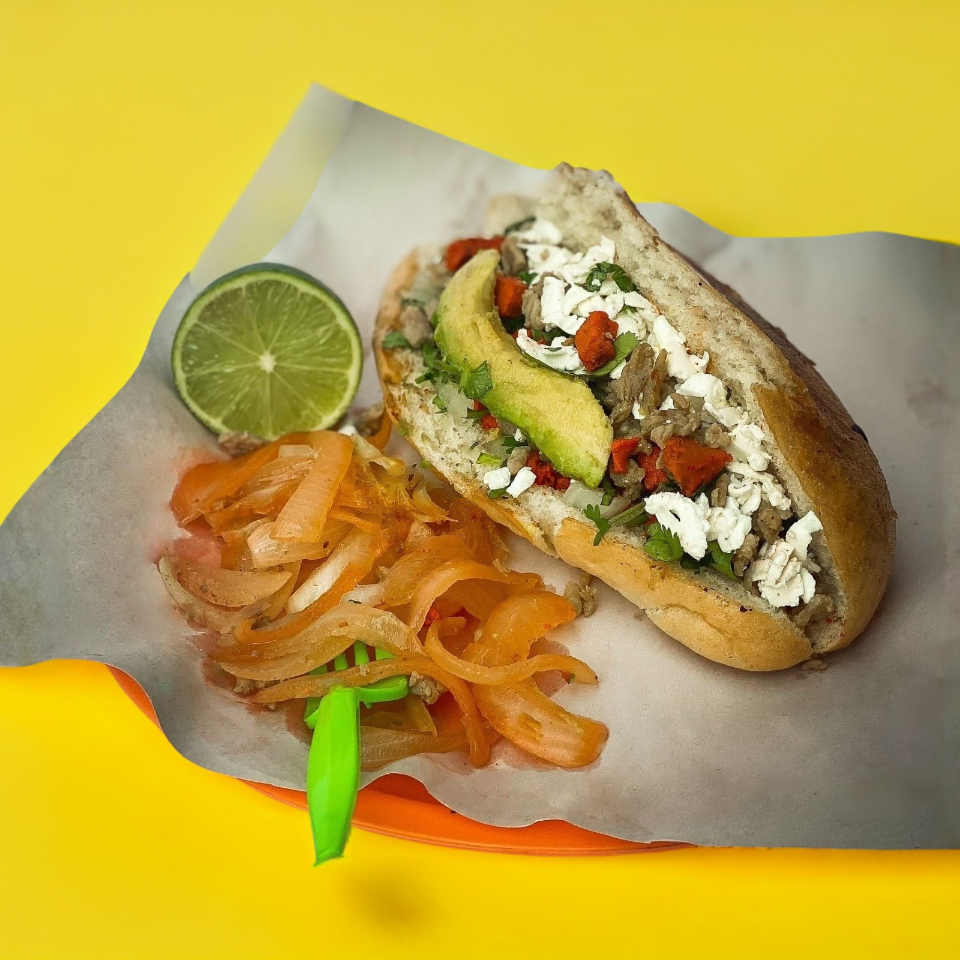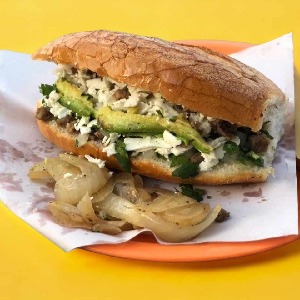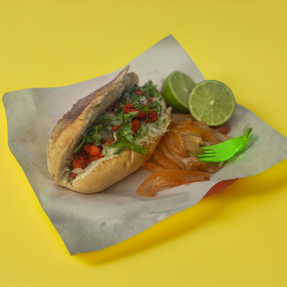 Platillo personal ;Con 2 panes bolillo rellenos de carne bistec de res , el ingrediente que elijas, cebolla asada, limón, salsa verde y salsa roja.