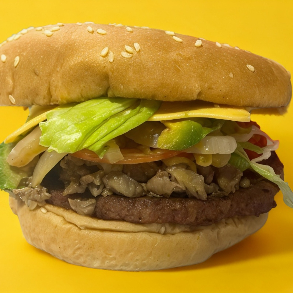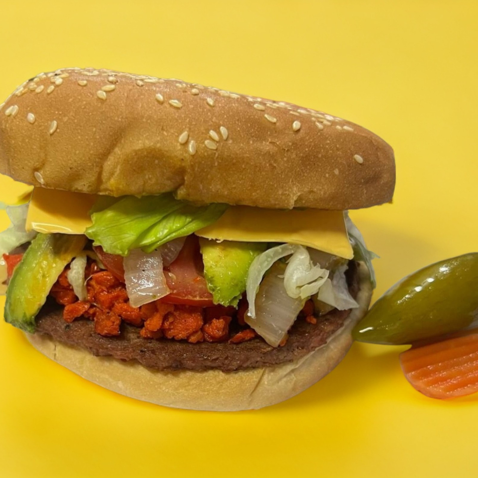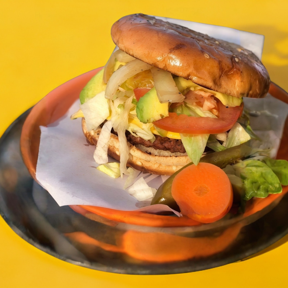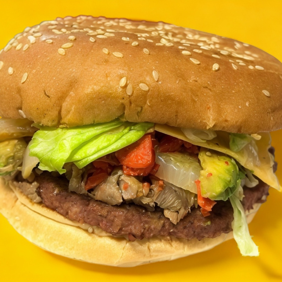 Carne de Hamburguesa, Bistec, Mayonesa, Mostaza, Lechuga, Tomate, Pepinillo, Aguacate y Cebolla Asada.
