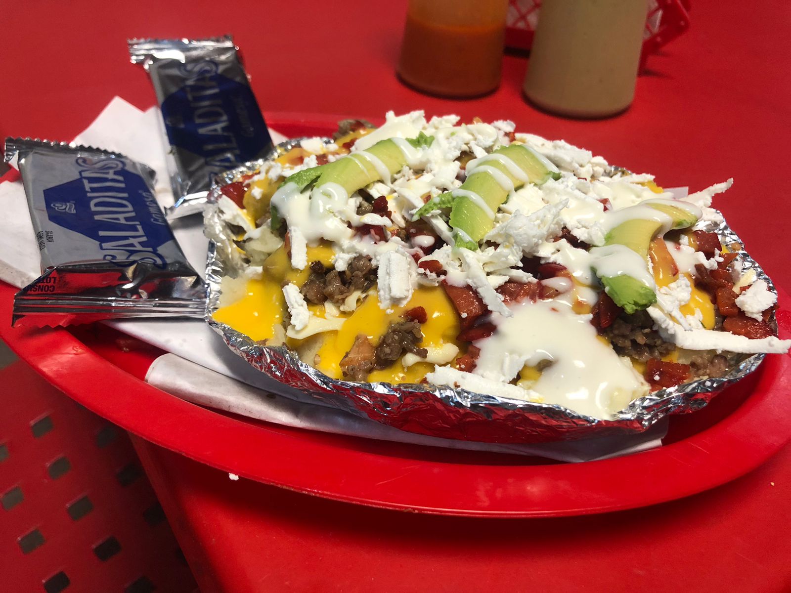Queso amarillo, queso blanco, salchicha, crema, aguacate