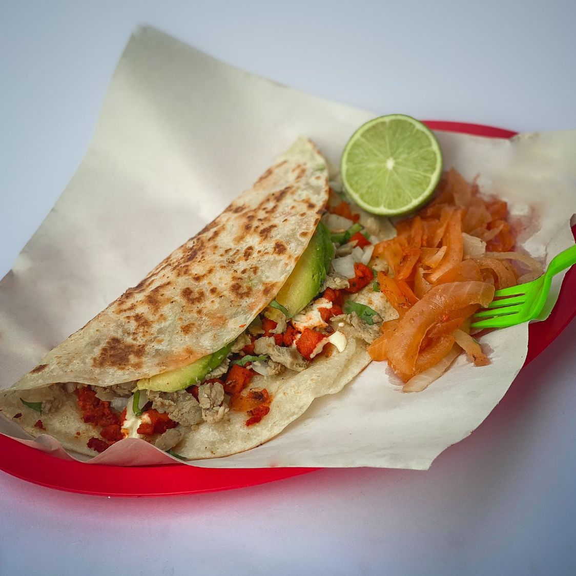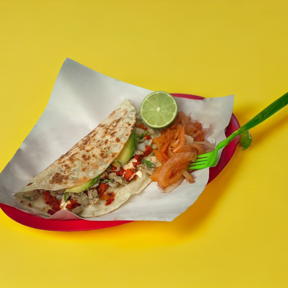 De harina con Bistec, Pastor, Queso Asadero, Cebolla cruda, Cilantro, Aguacate y Cebolla asada.