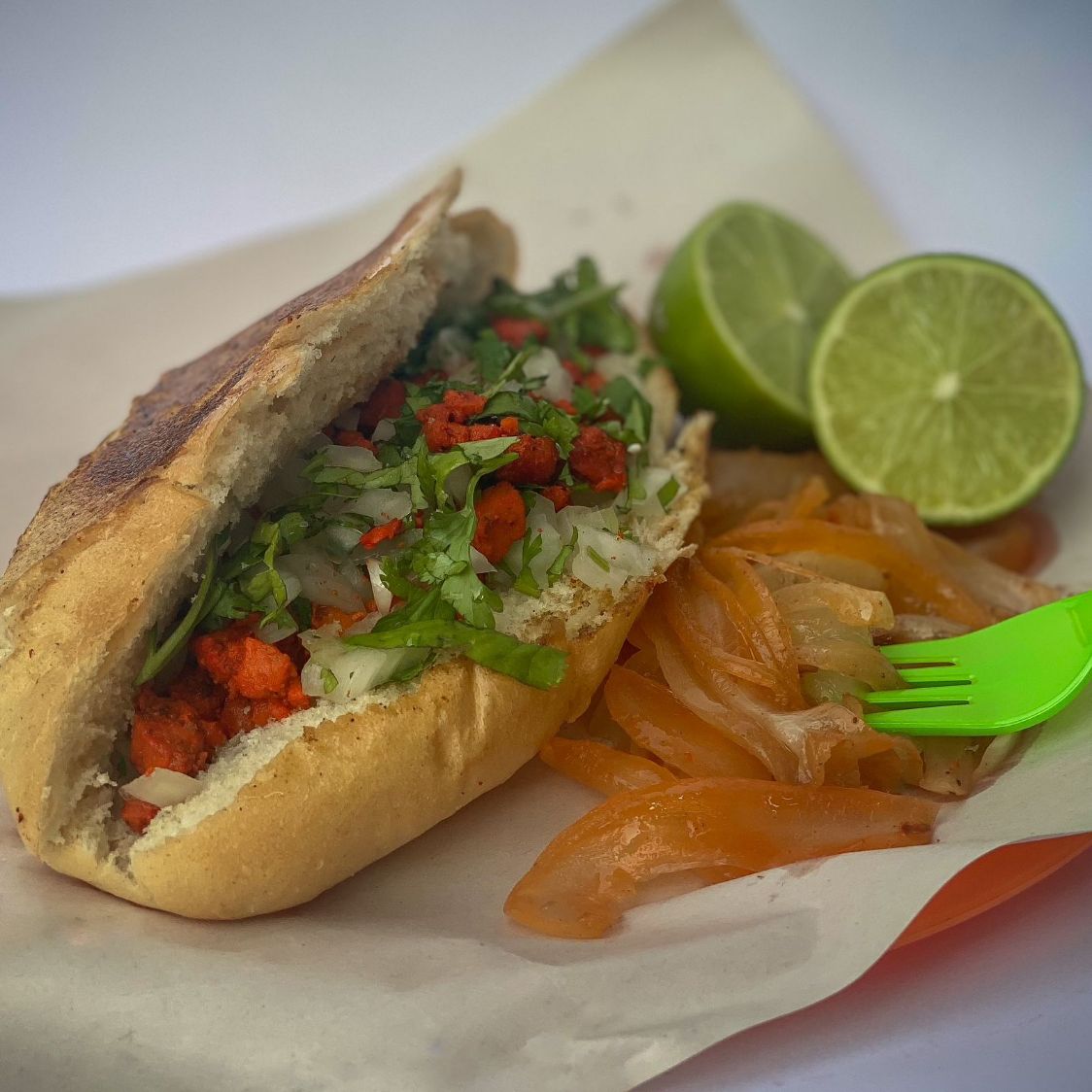Platillo personal ;Con 2 panes bolillo rellenos de carne bistec de res , el ingrediente que elijas, cebolla asada, limón, salsa verde y salsa roja