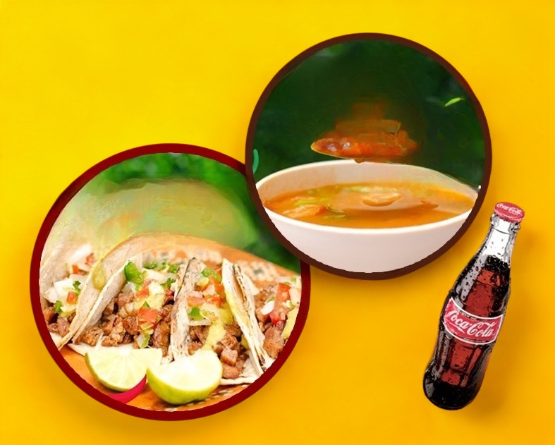 Taco de Carne Asada 70 gramos Maíz*4 acompañado con totopos, limón y salsa + 8oz de Frijoles Charros1 + Coca cola original plástico 355 ml*1