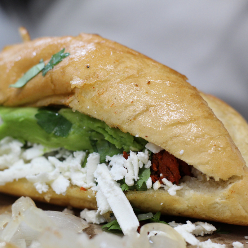 Acompañada de queso asadero, cilantro, cebolla, queso y aguacate.