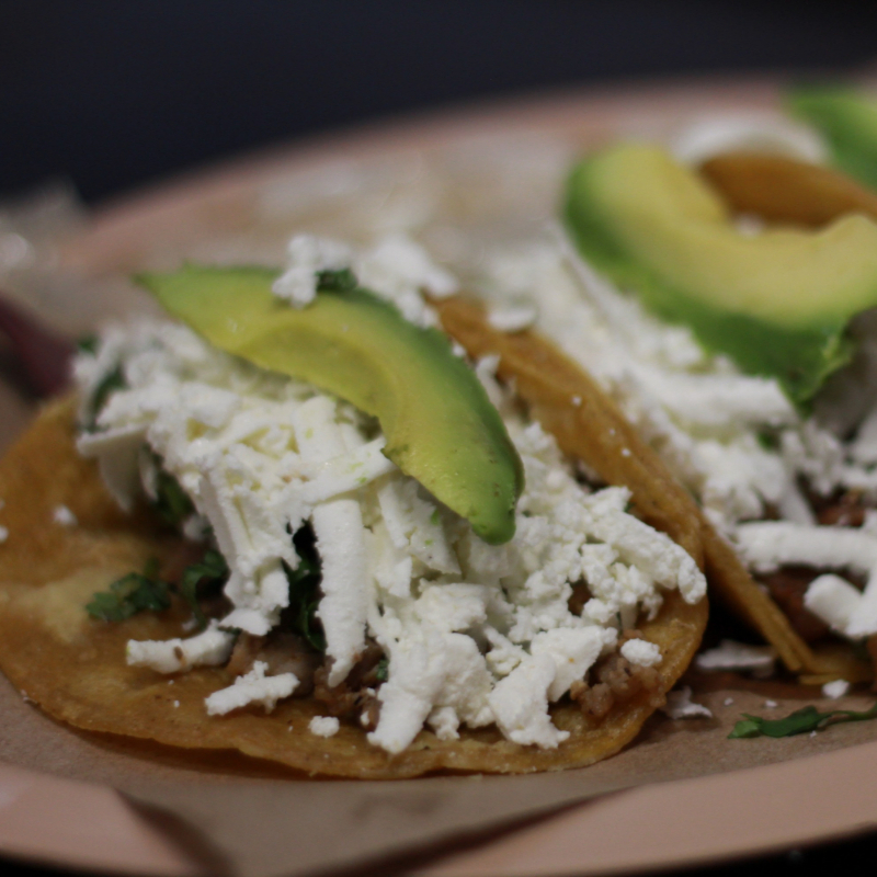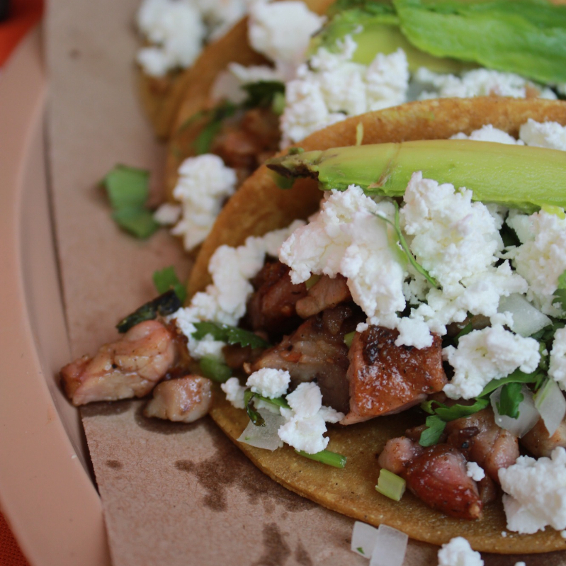 Acompañado de cilantro, cebolla, queso y aguacate.