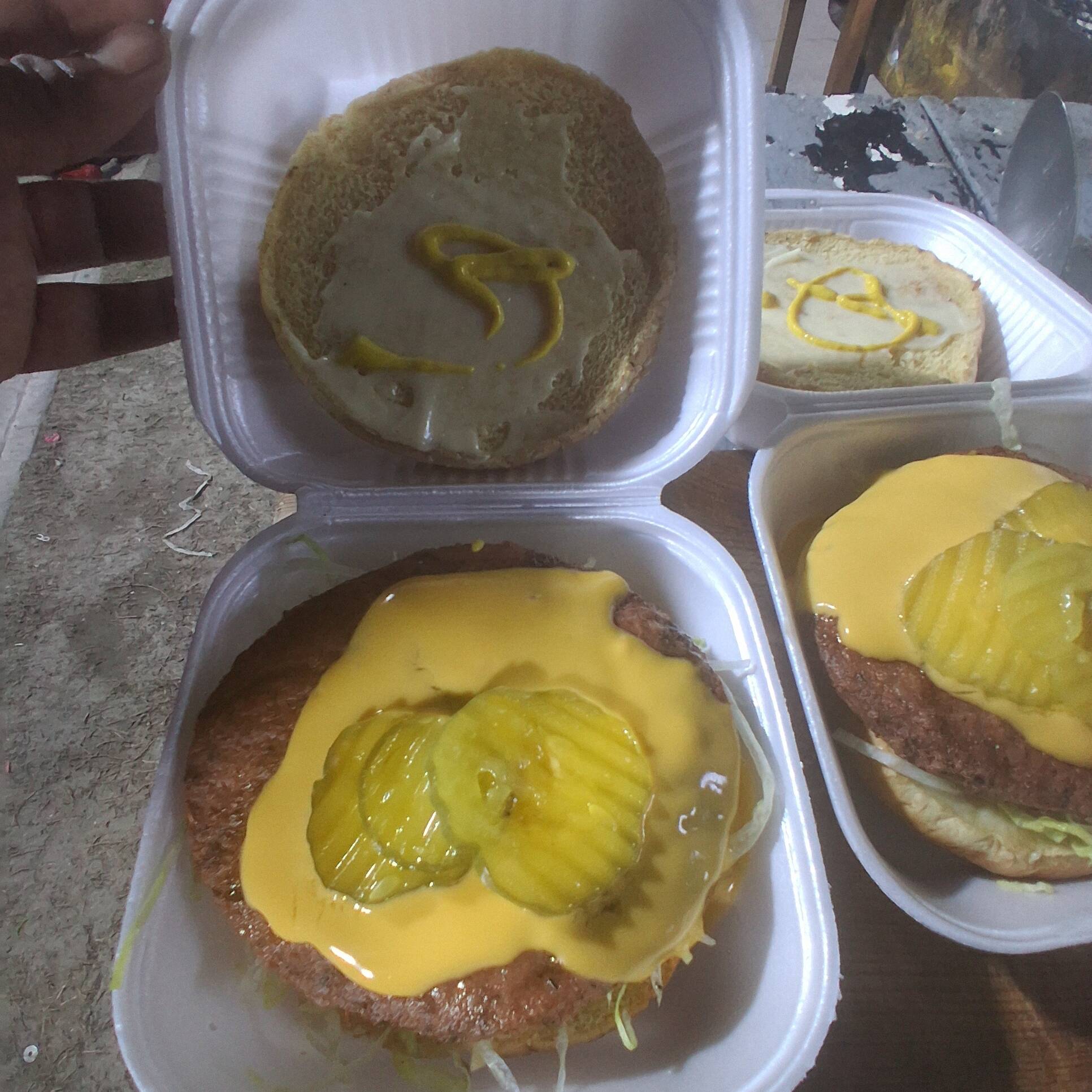 mayonesa, mostasa, lechuga, carne, queso amarillo derretido, pepinillos