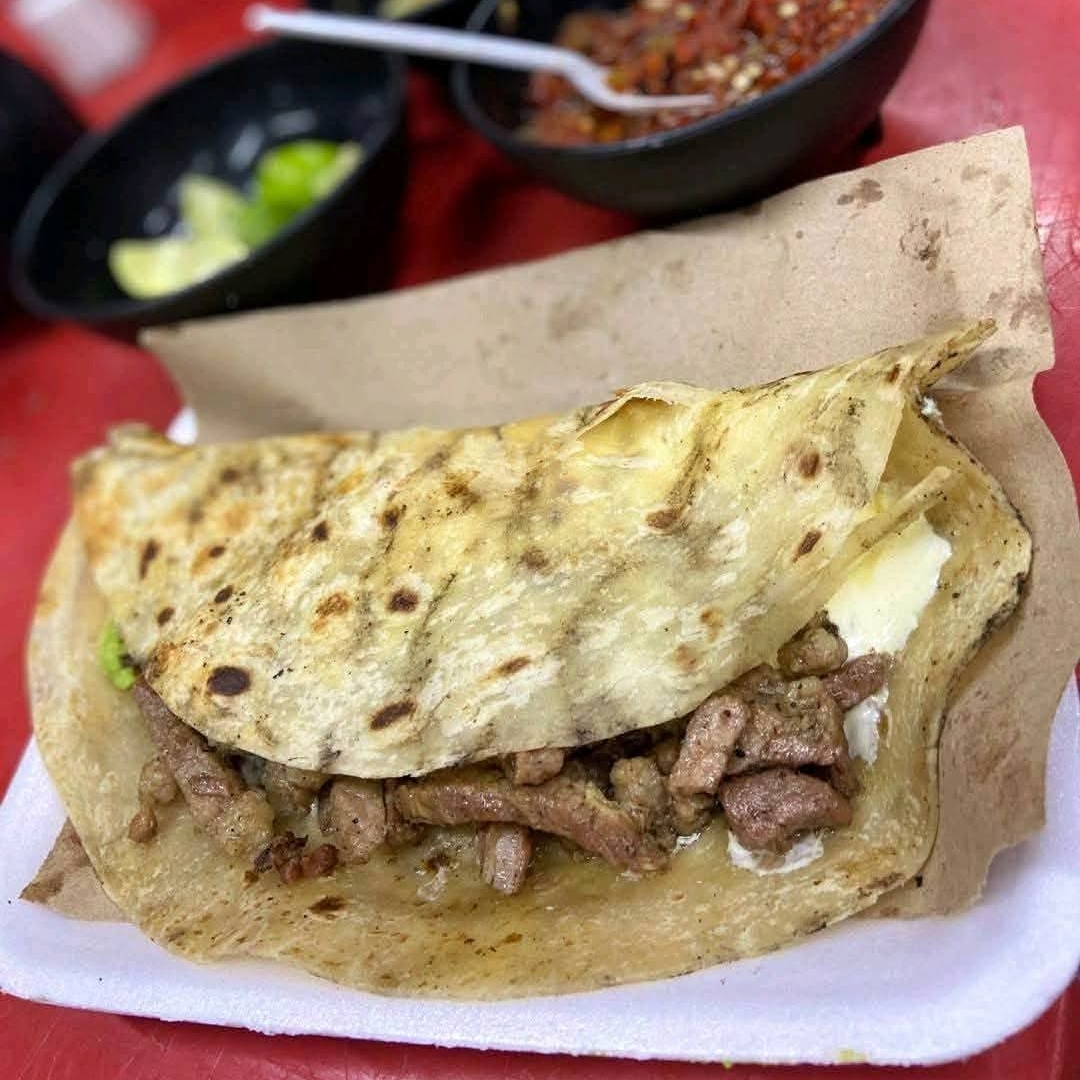TORTILLA DE HARINA GDE QUESO ASADERO CARNE ASADA Y AGUACATE