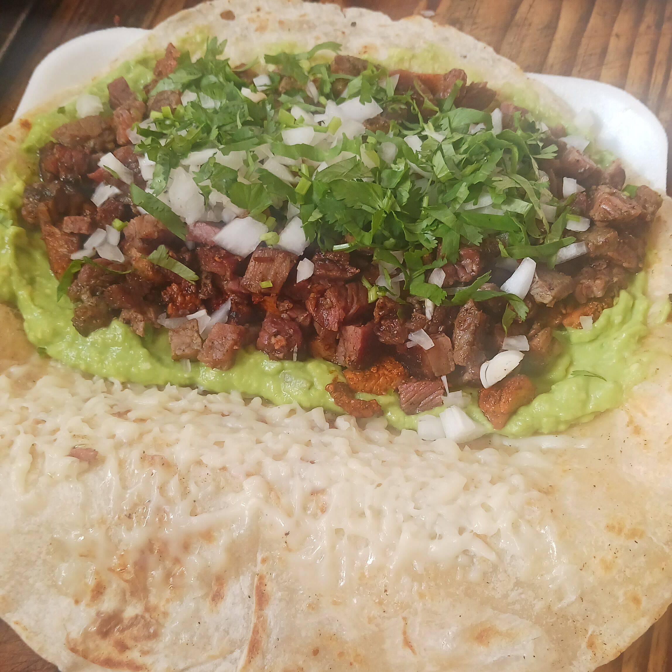 Tortilla de harina grande con carne asada ,queso tipo oaxaca, cebolla asada y cama de guacamole extra