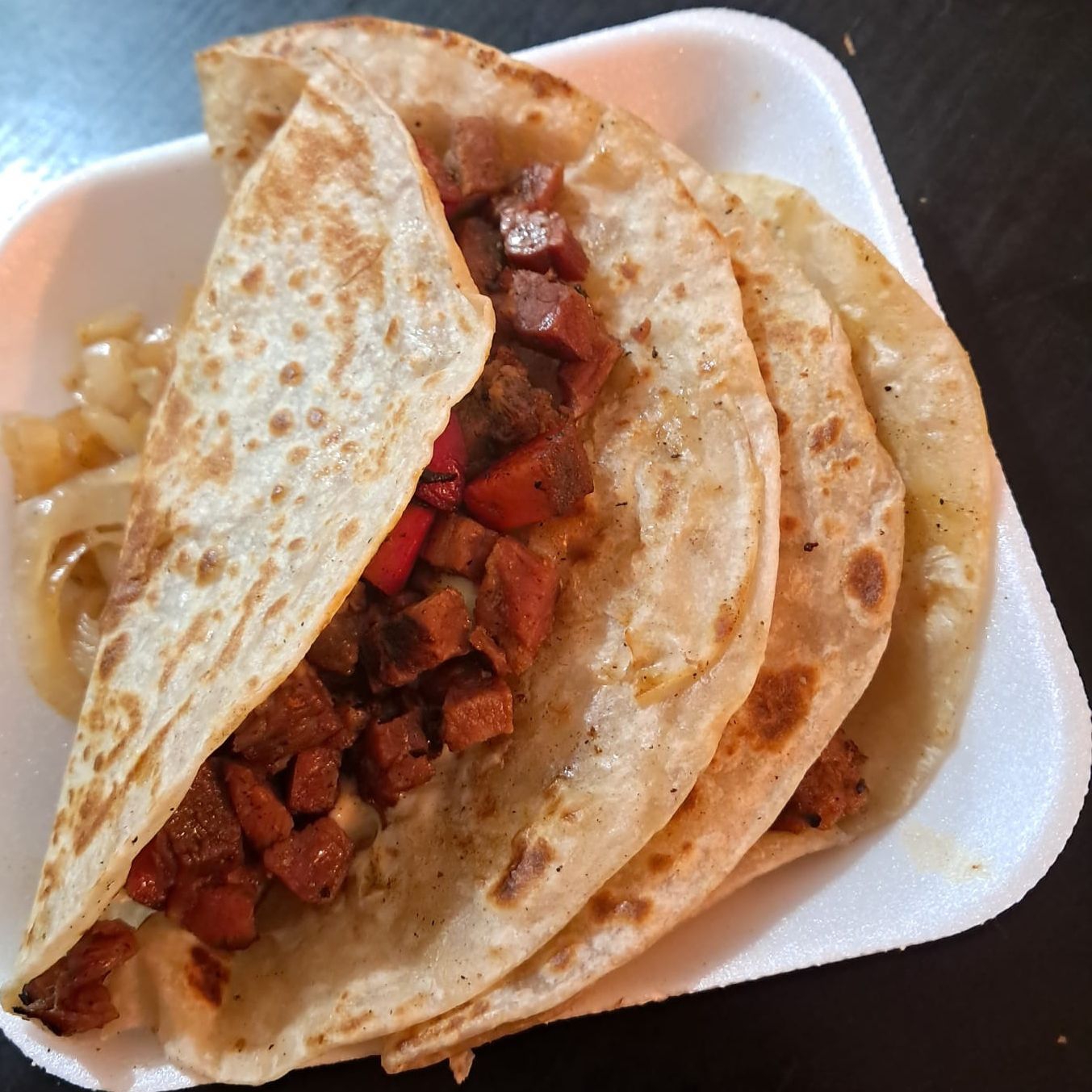 Tortilla de harina chica con queso tipo oaxaca, y carne asada