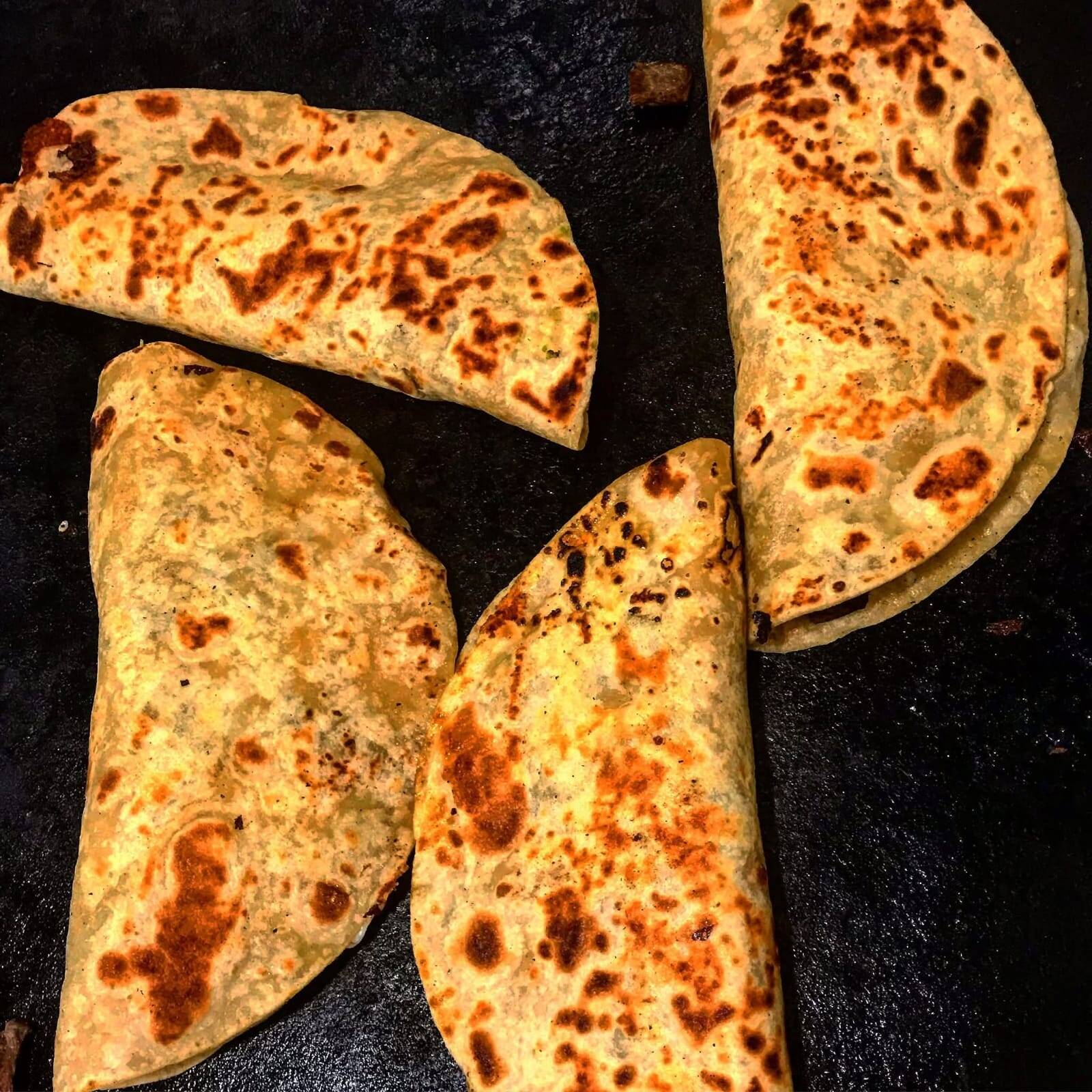Tortilla de harina, costra de queso asadero, cebolla cilantre aguacate, y PECHUGA