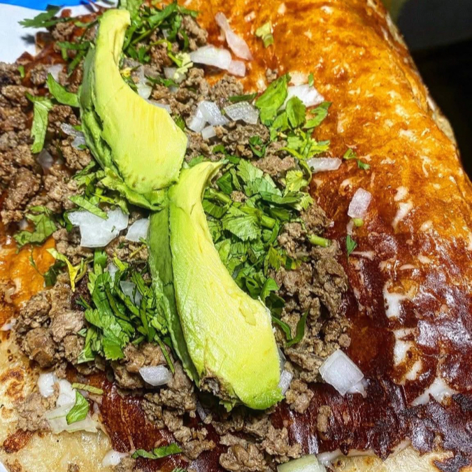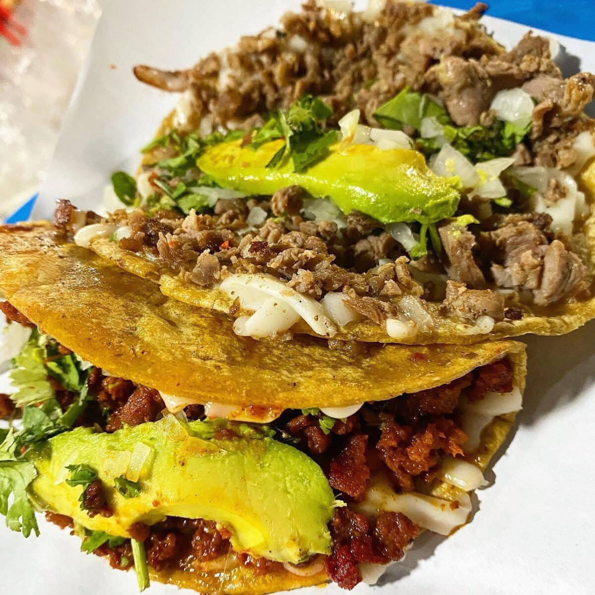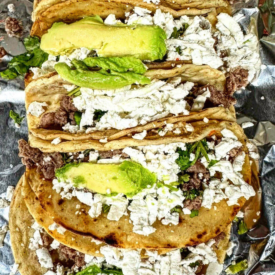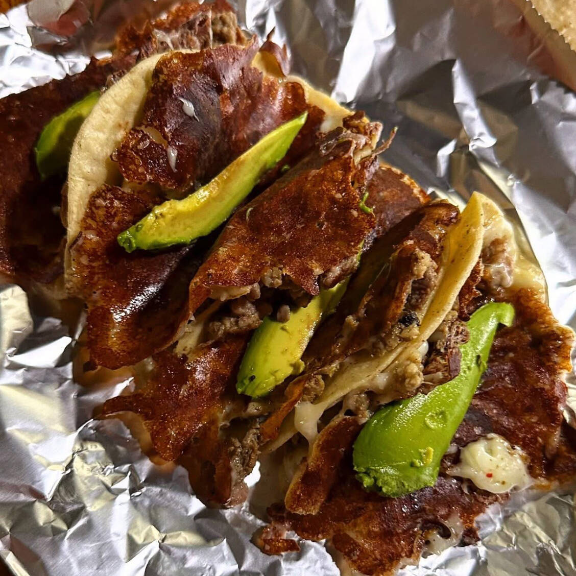 Tortilla de harina, costra de queso asadero, cebolla cilantre aguacate, y 2 carnes a elegir