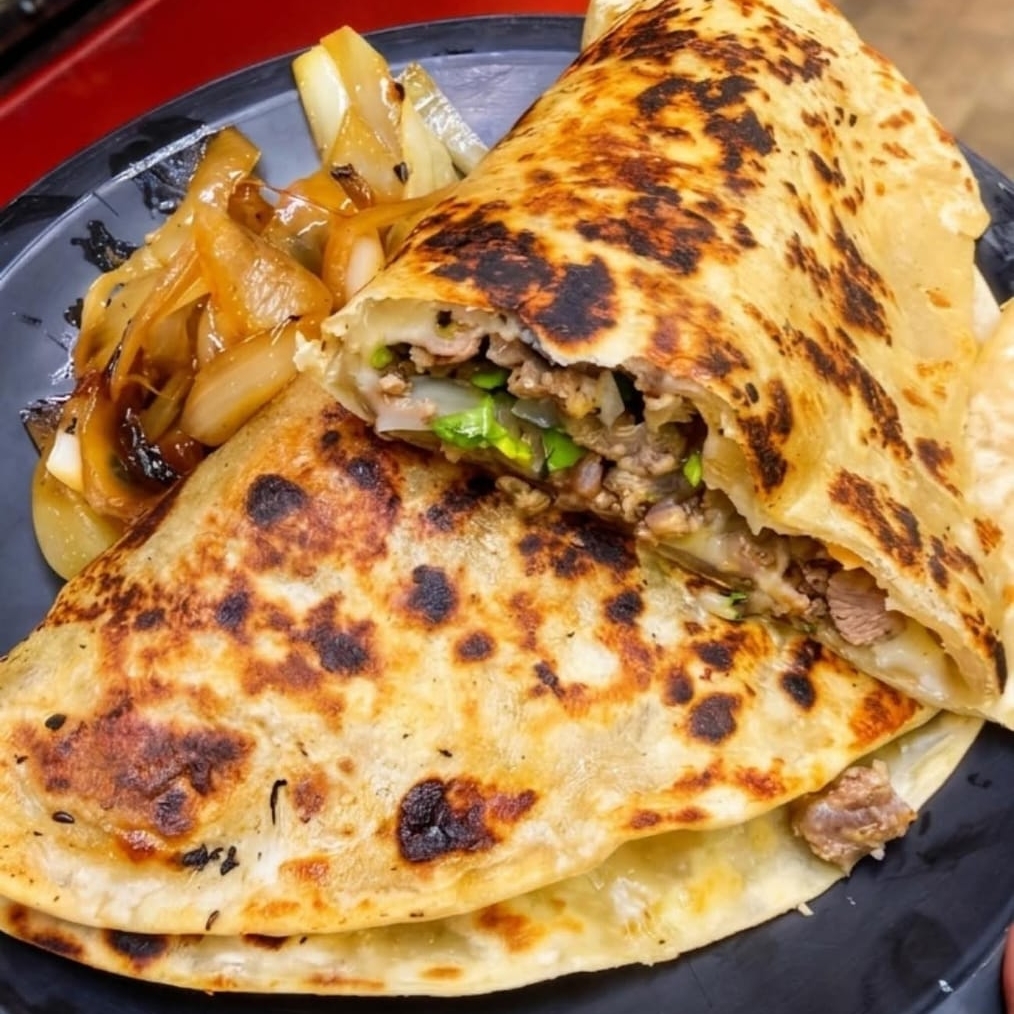 Tortilla de harina, costra de queso asadero, cebolla cilantre aguacate, y BISTEC