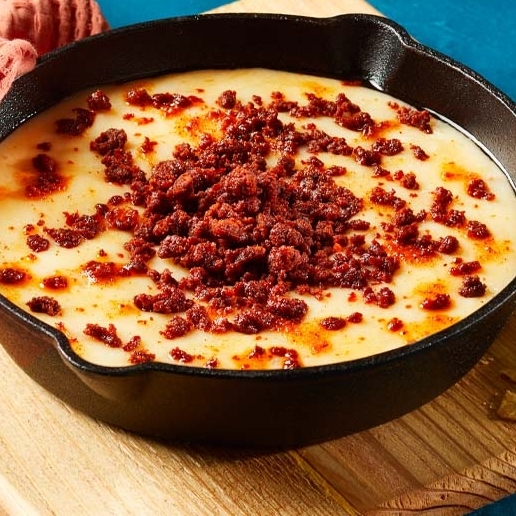 Queso asadero fundido con aguacate totopos y carne a elegir