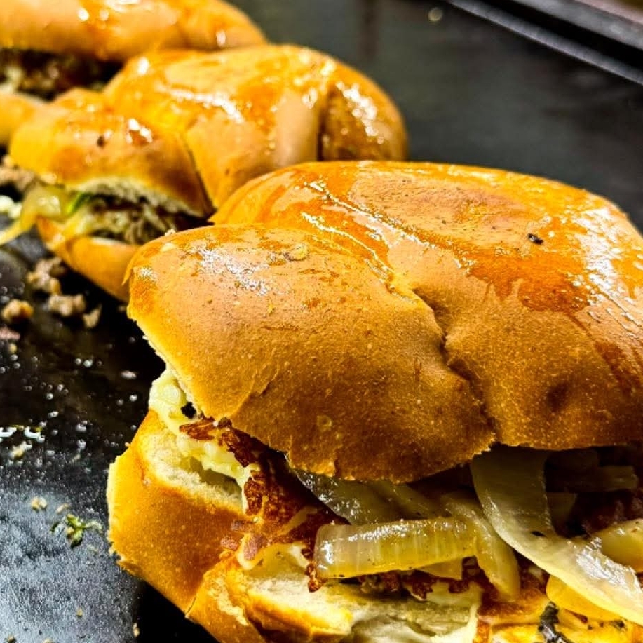 Pan telera costra de queso, aguacate. cebolla asada y Bistec