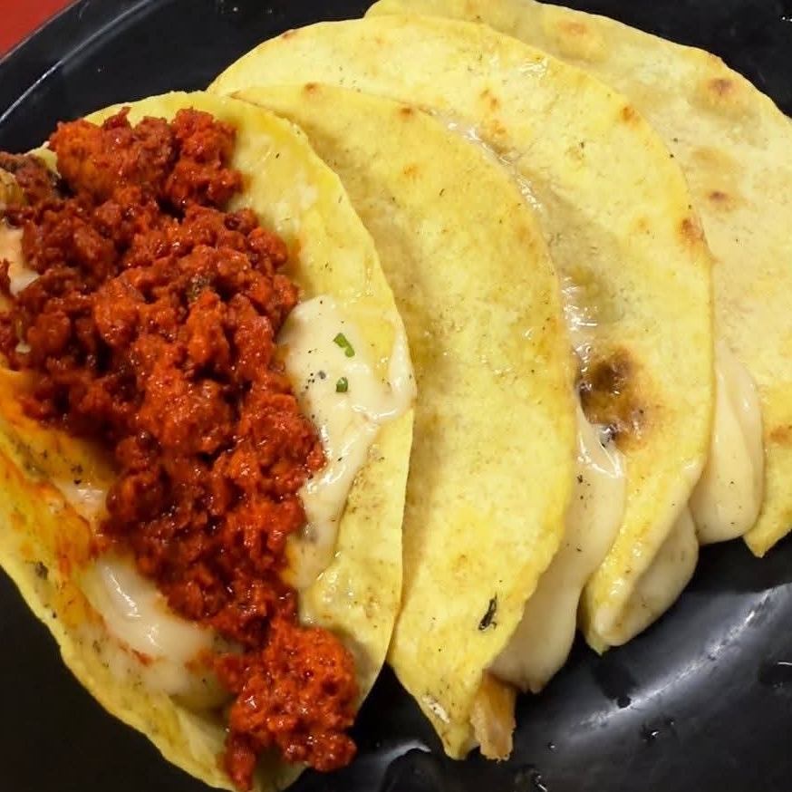 Tortilla taquera, costra de queso asadero, y2 carnes a elegir