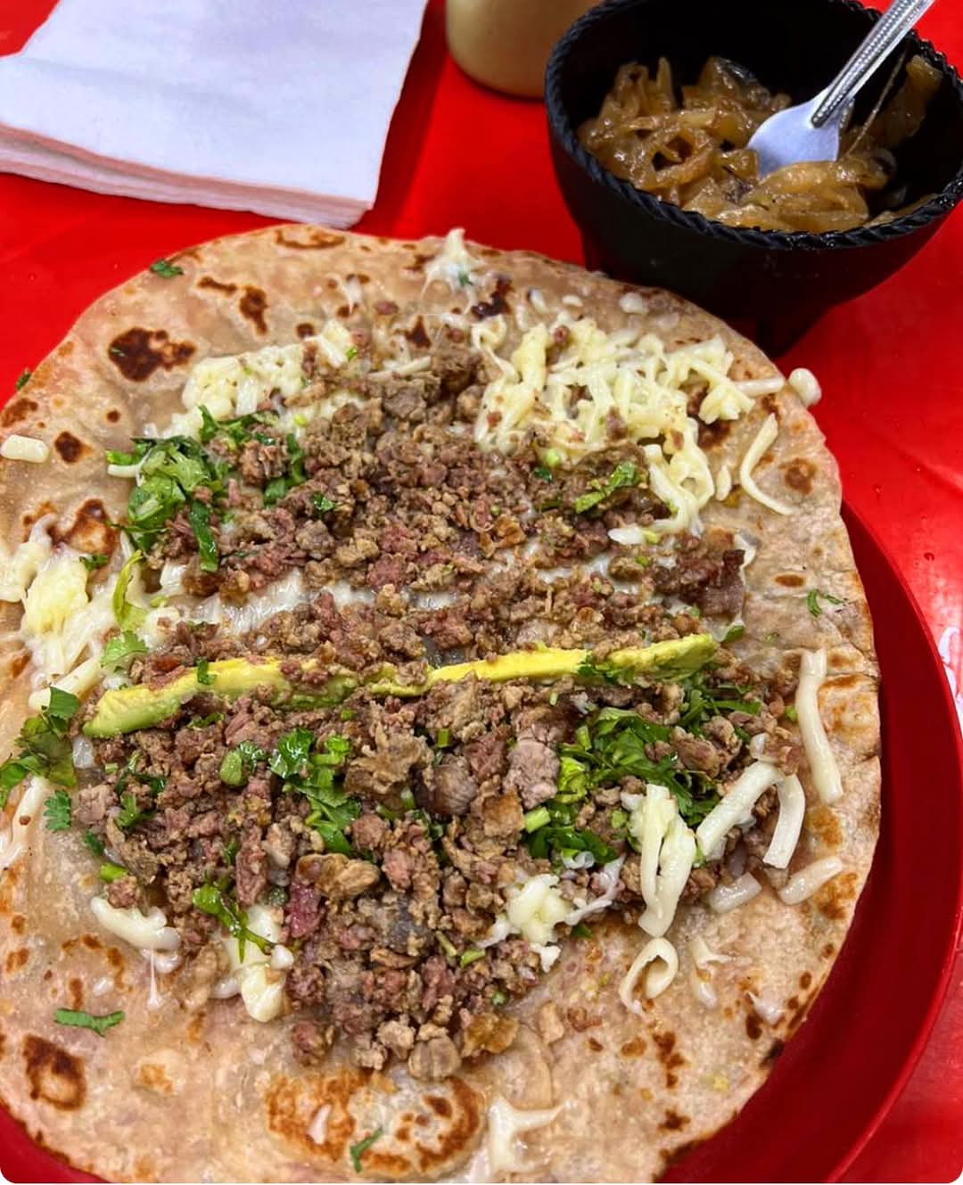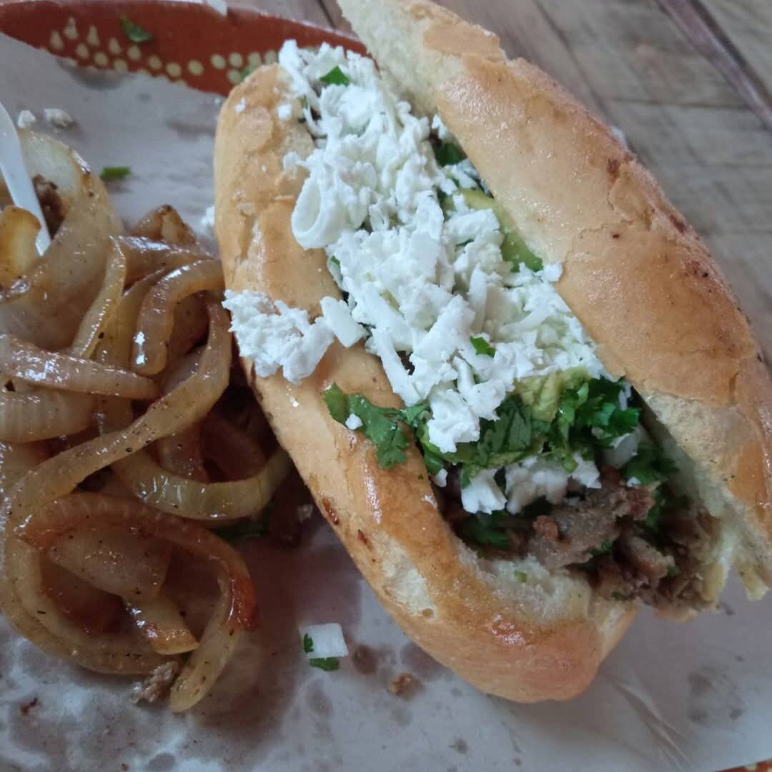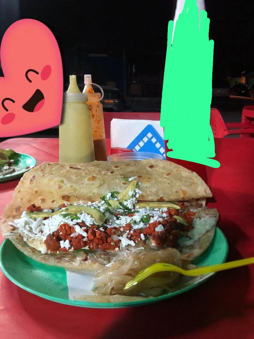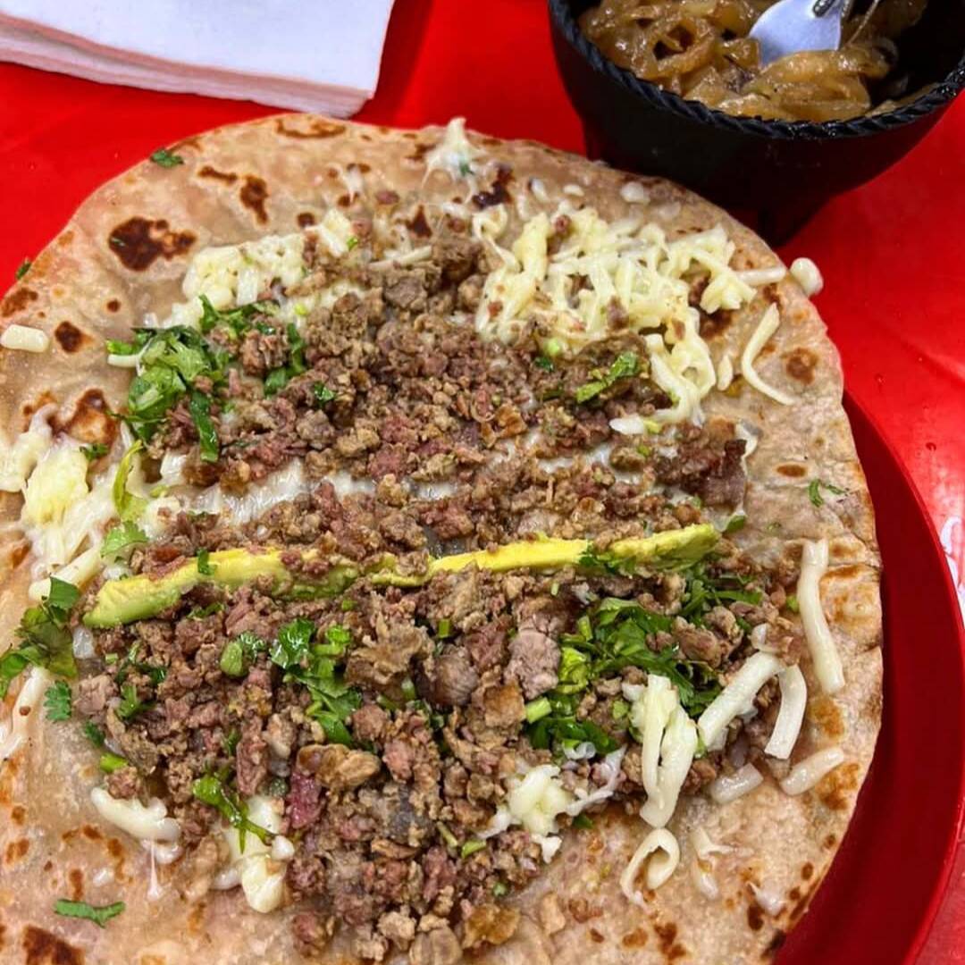 Pastor bistek cebolla cruda queso aguacate limón salsa verde salsa habanero cebollitas queso Oaxaca