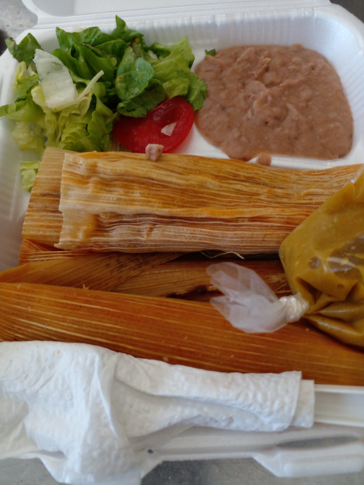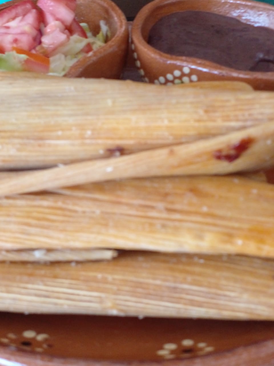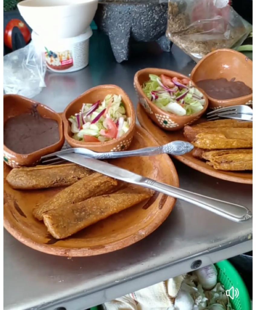3 platillos con 4 tamales C/U con porcion de frijoles y ensalada y 3 refrescos