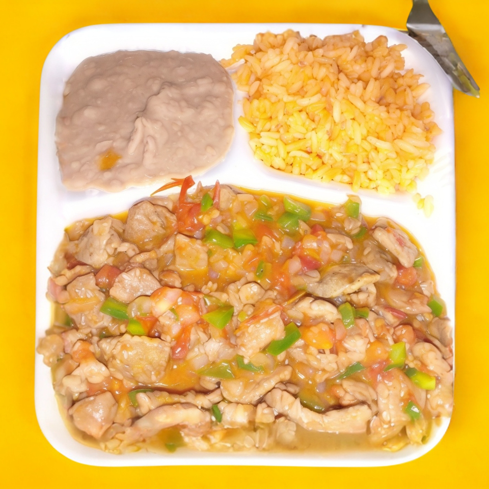 Bistec ranchero con frijoles y arroz