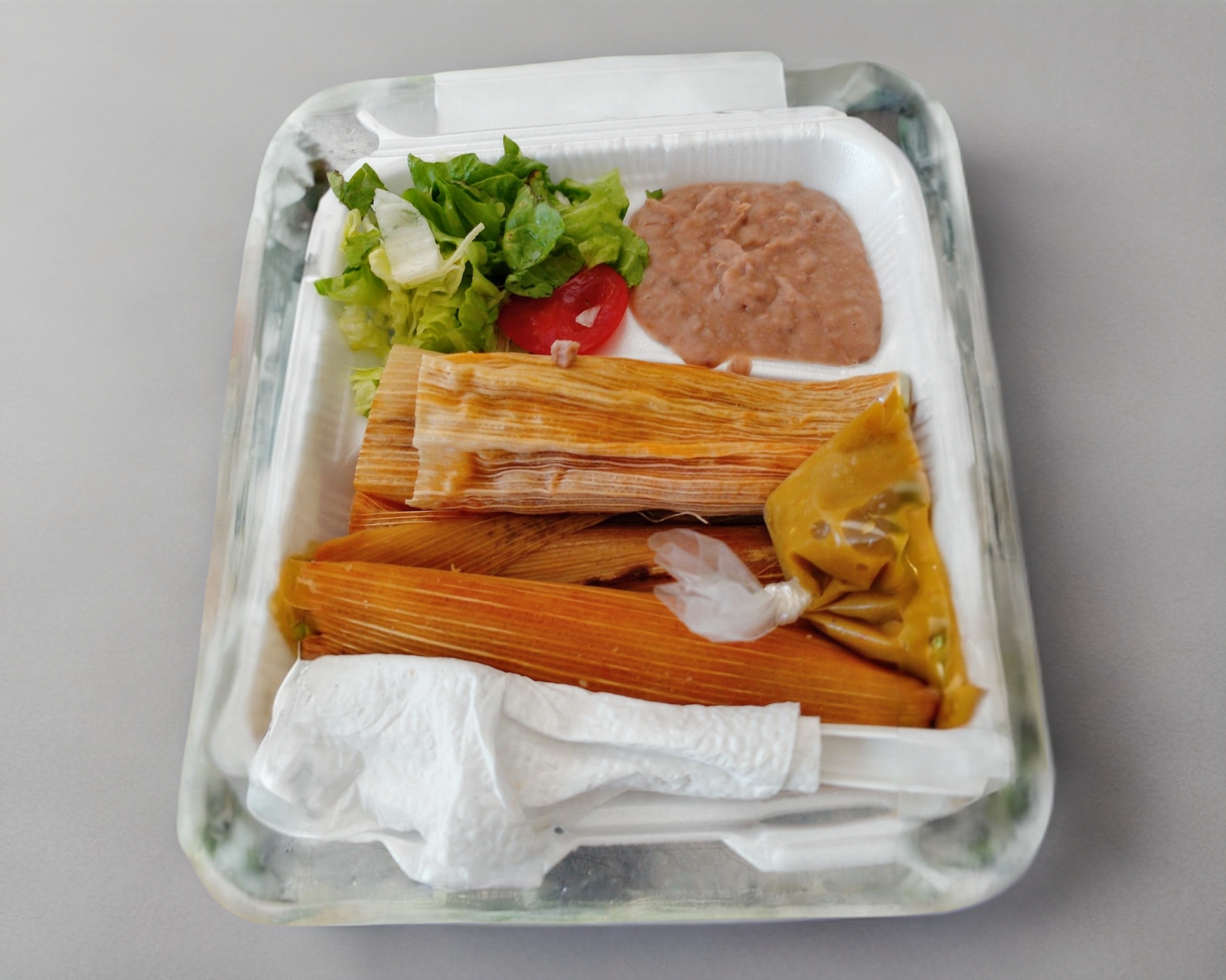 1 pieza de tamal veracruzano de 60 gramos Pollo 240 de mata // 1 pieza de tamal veracruzano 60 gramos de Puerco 250 gramos de mata ,acompañado con verdura(lechuga, latabia, repollo morado y col ) y salsa roja o verde ( la que este disponible(bolsita)). + cubiertos desechables