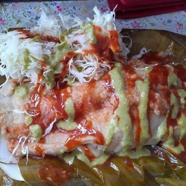 Tamal de Pollo, con verdura (repollo) salsa verde y roja (o a su gusto).