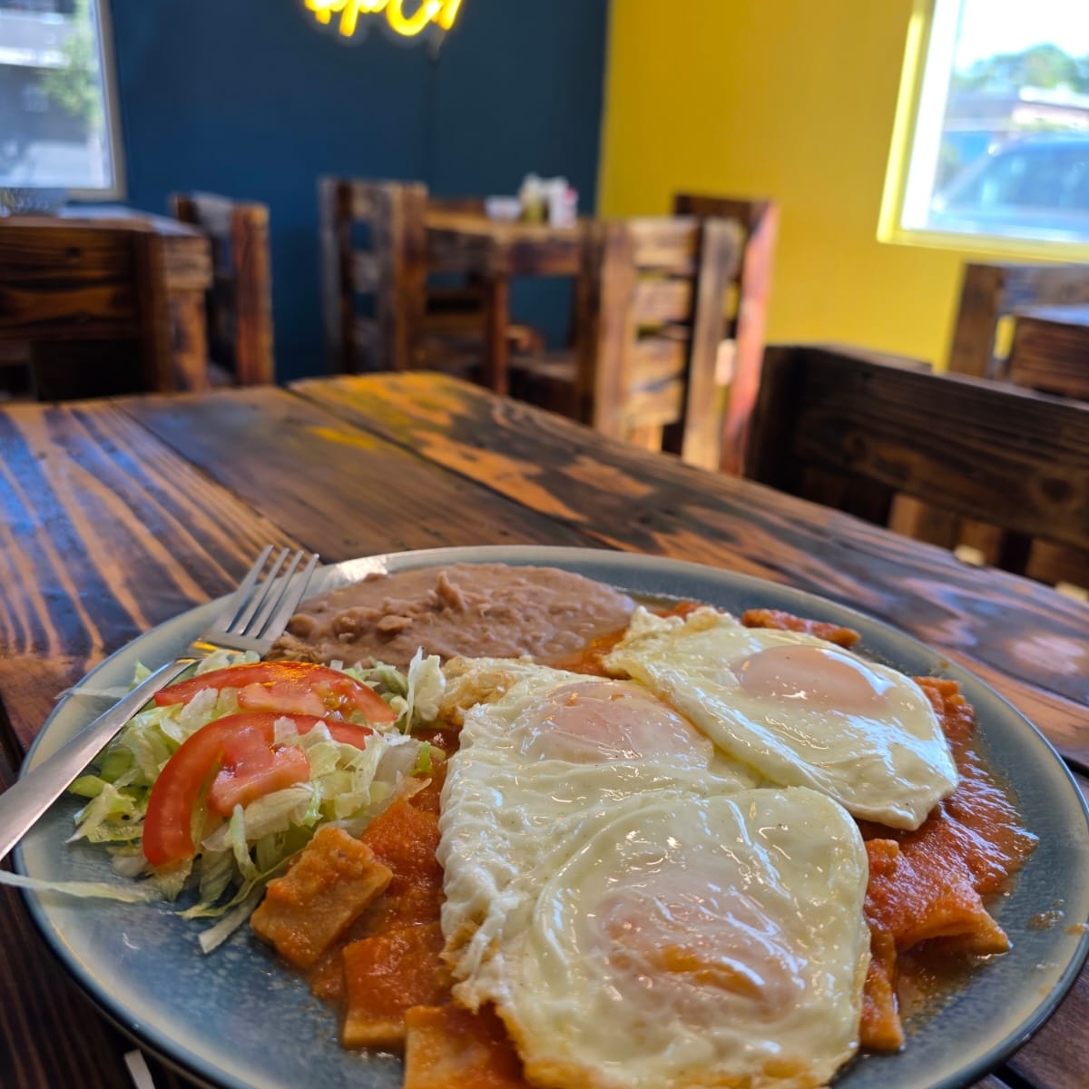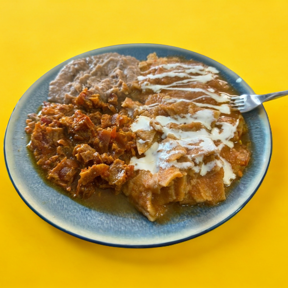 Deliciosos chilaquiles con nuestra salsa especial acompanado de frijoles refritos y ensalada
