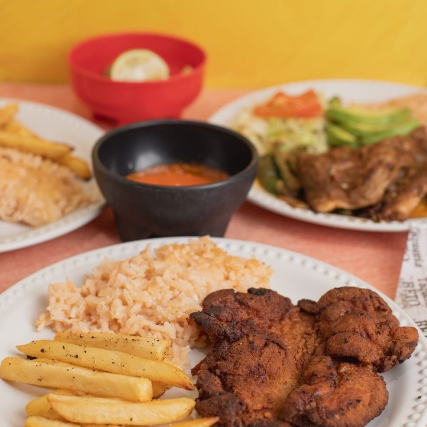 Deliciosa chuletas de puerco acompanado de arroz, frijoles, ensalada y 5 tortillas