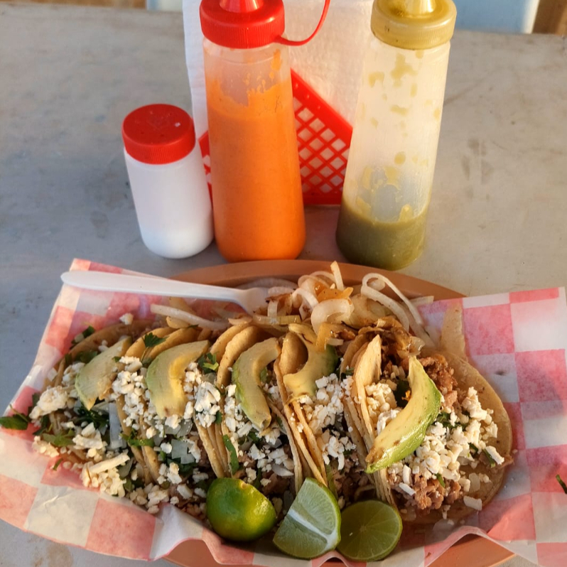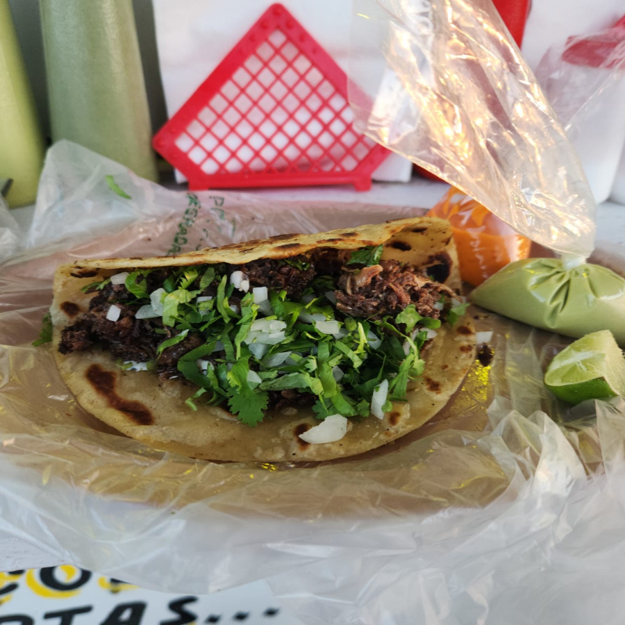 Tortilla doradita, carne jugosa, ademas de verdura, cebolla asada, aguacate, limon y salsas muy ricas