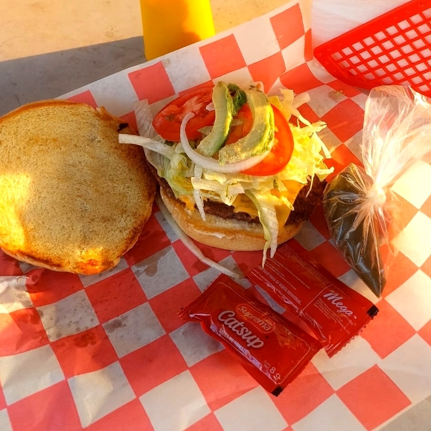 Pan suave, carne jugosa y deliciosa, acompañado de lechuga, tomate, cebolla, aguacate y chiles jalapeños