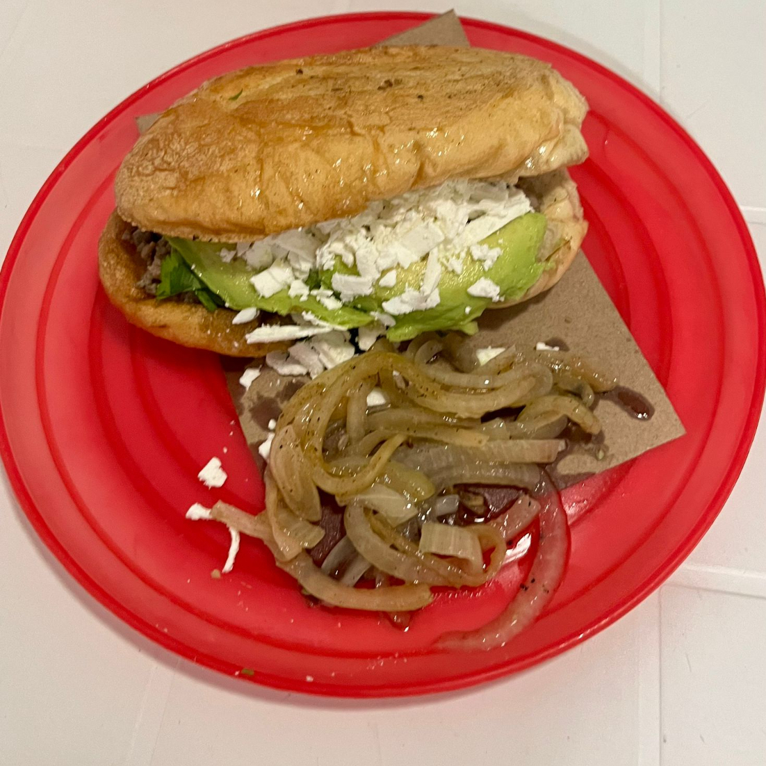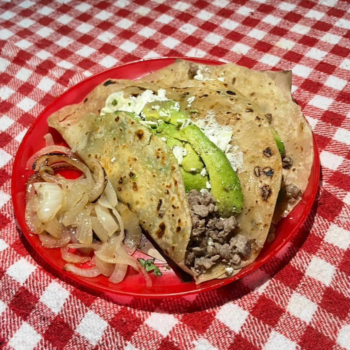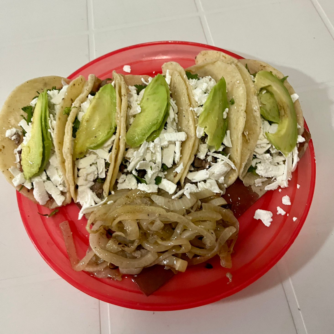 T.de harina (tamaño regular) con carne de bistec, queso asadero, queso taquero, cilantro, aguacate y cebolla