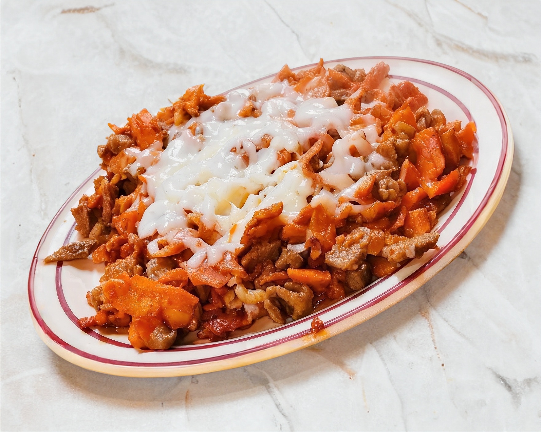 Bistec, cebolla, chile poblano, jamón y queso asadero