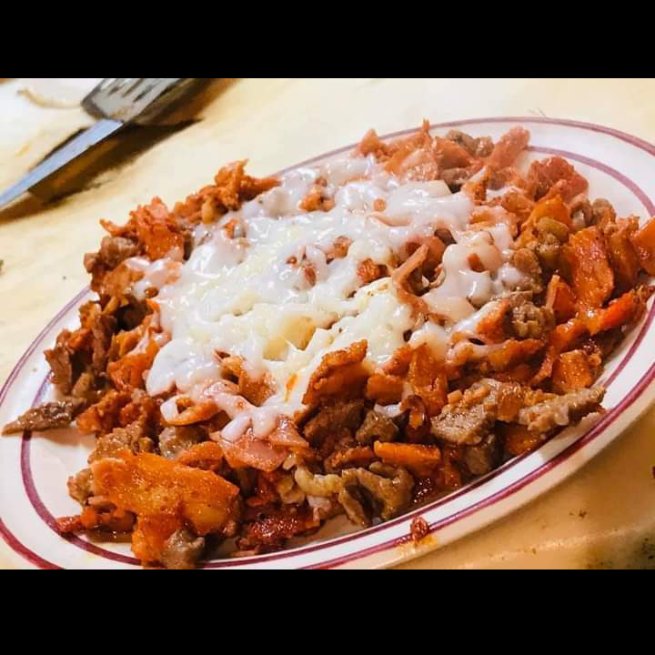 Bistec, pastor, chorizo, cebolla, poblano y queso asadero