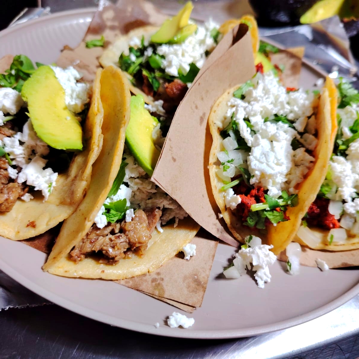 Taco de suadero con queso y aguacate y verdura aparte.