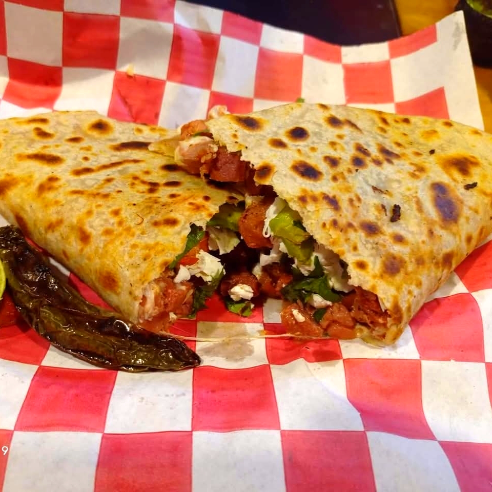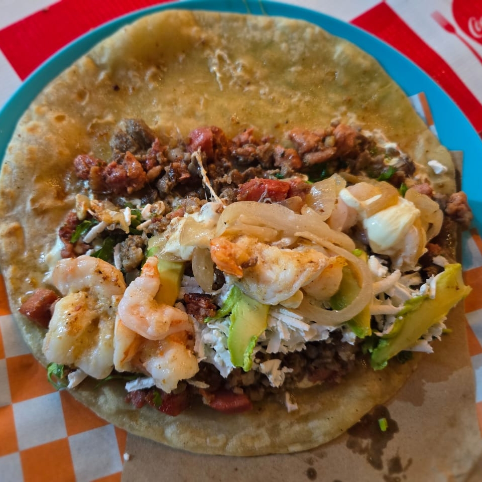 tortilla de harina con queso fundido ,rellena de combinacion de carnes y camarones preparados a la plancha y sazonados con mantequilla con ajo.