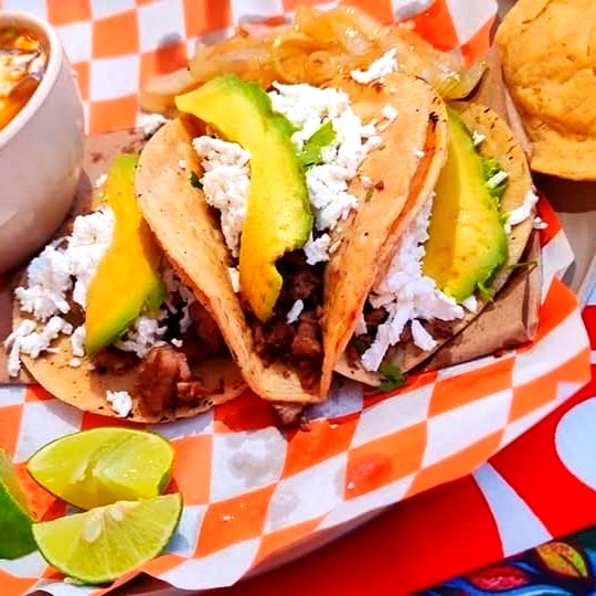 Taco de carne asada con queso y aguacate y verdura aparte.