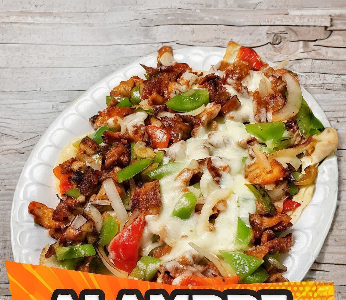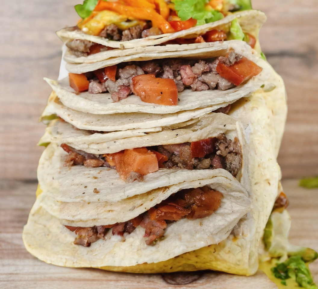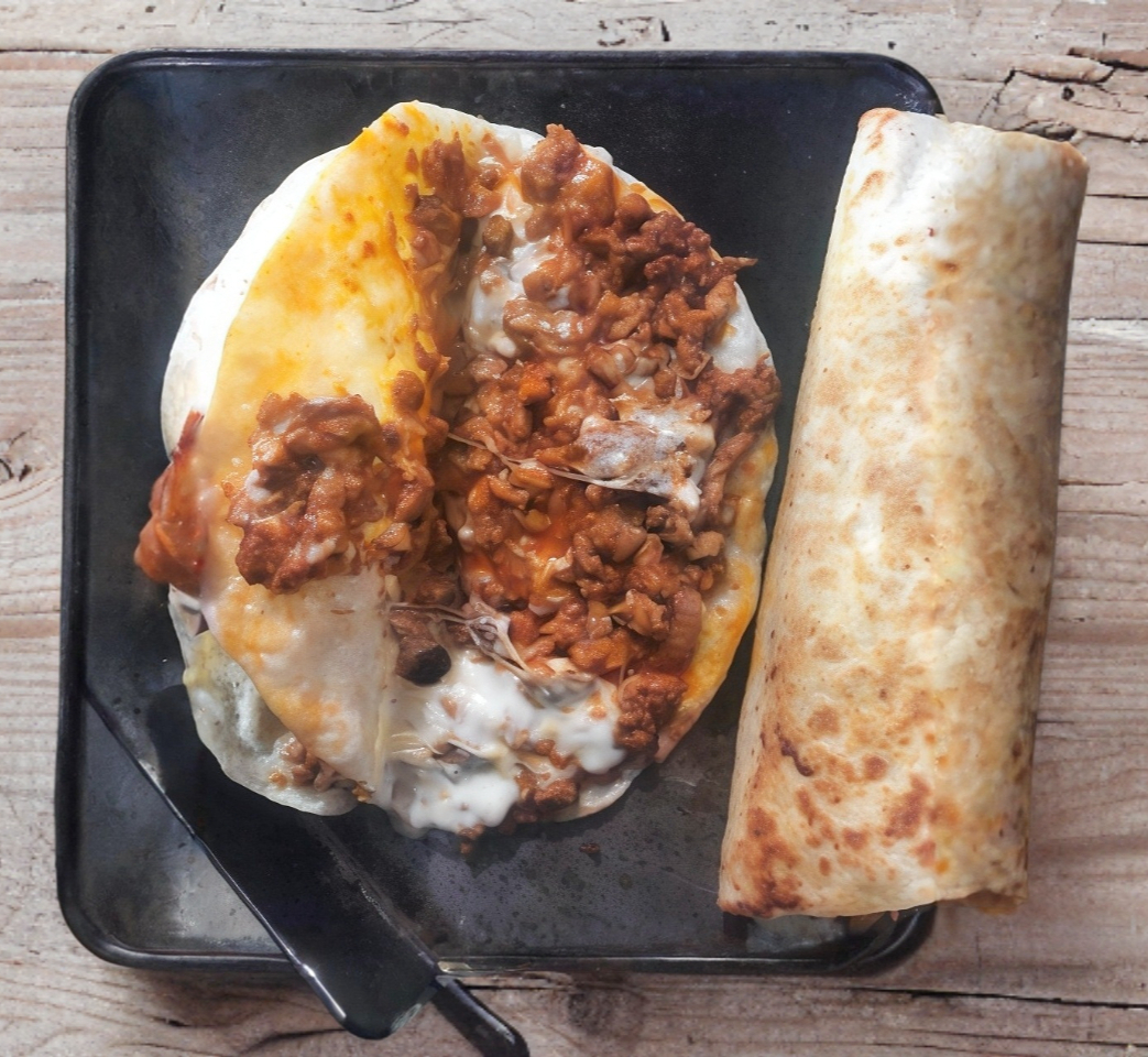 Tortilla de harina de 25 cm, queso asadero, pastor, bistec, salchicha asada, longaniza, carne asada, cebolla, cilantro y queso canasto.