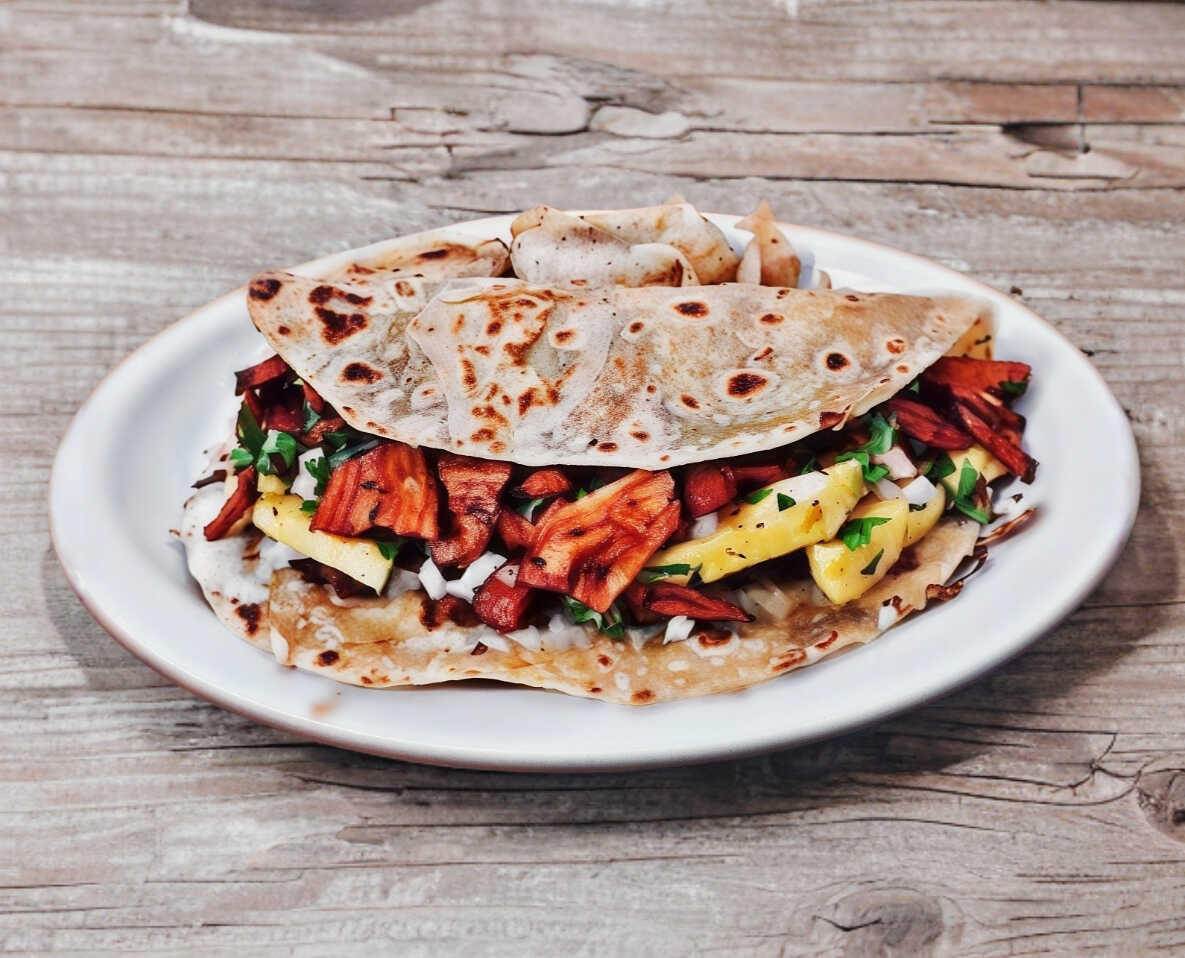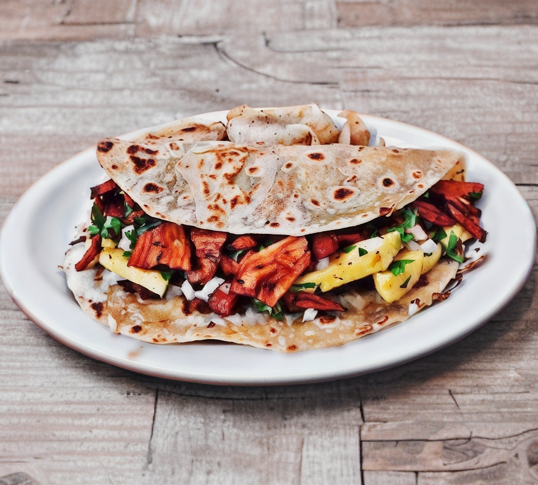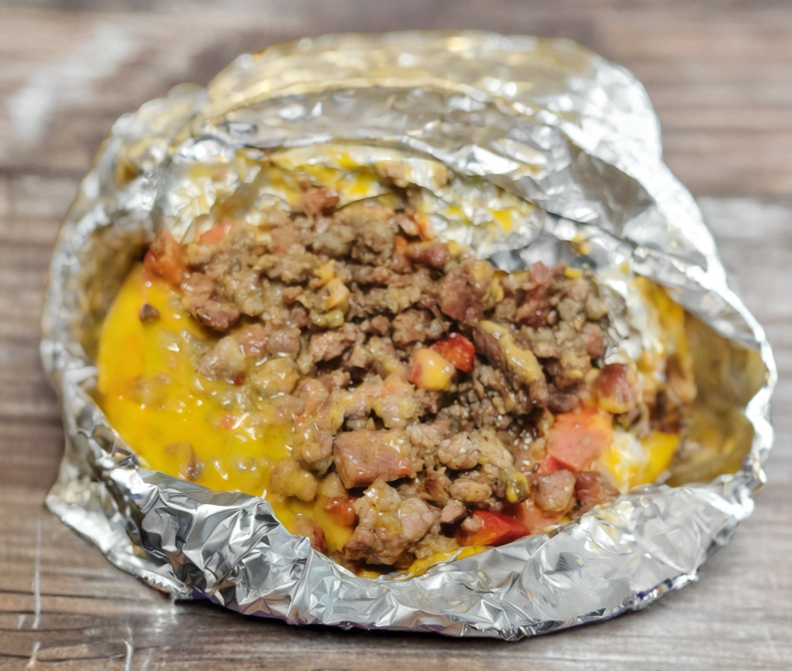 Tortilla de harina de 25 cm, queso asadero, pastor, bistec, salchicha asada, longaniza, carne asada, cebolla, cilantro y queso canasto.