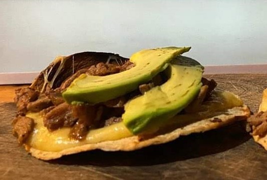Tostada hecha al fuego con queso asadero, carne asada y aguacate.