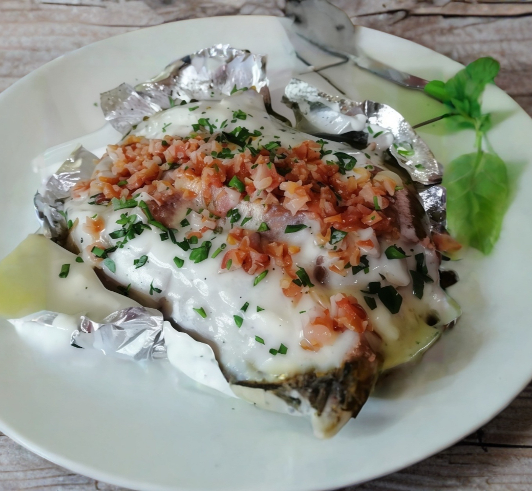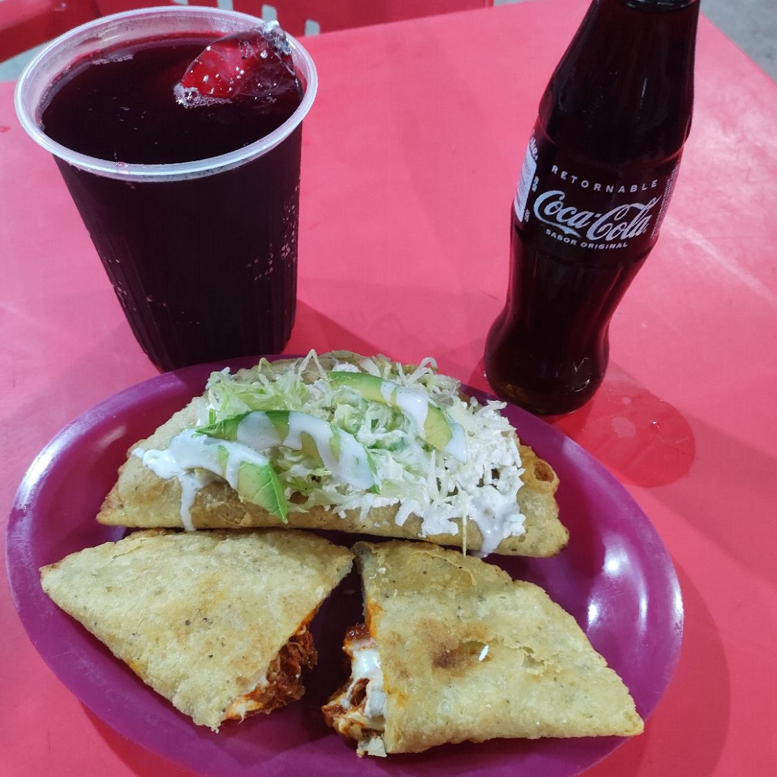 Empanada de masa con queso asadero y guiso de desebrada acompañado de lechuga y aguacate