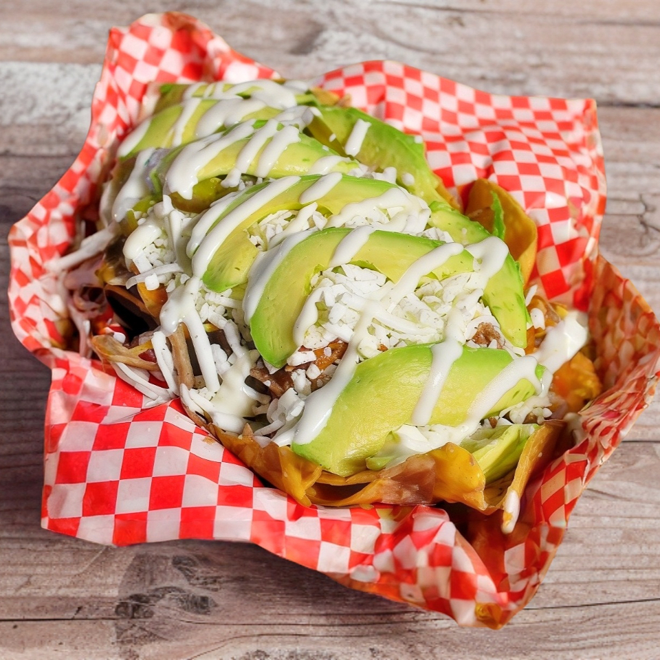 FRIJOLES, SALSA, CARNE DESHEBRADA, QUESO AMARILLO, QUESO BLANCO, CREMA, JALAPEÑOS, AGUACATE.