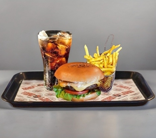 Paquete de burguer basica con porcion de papas y un refresco.