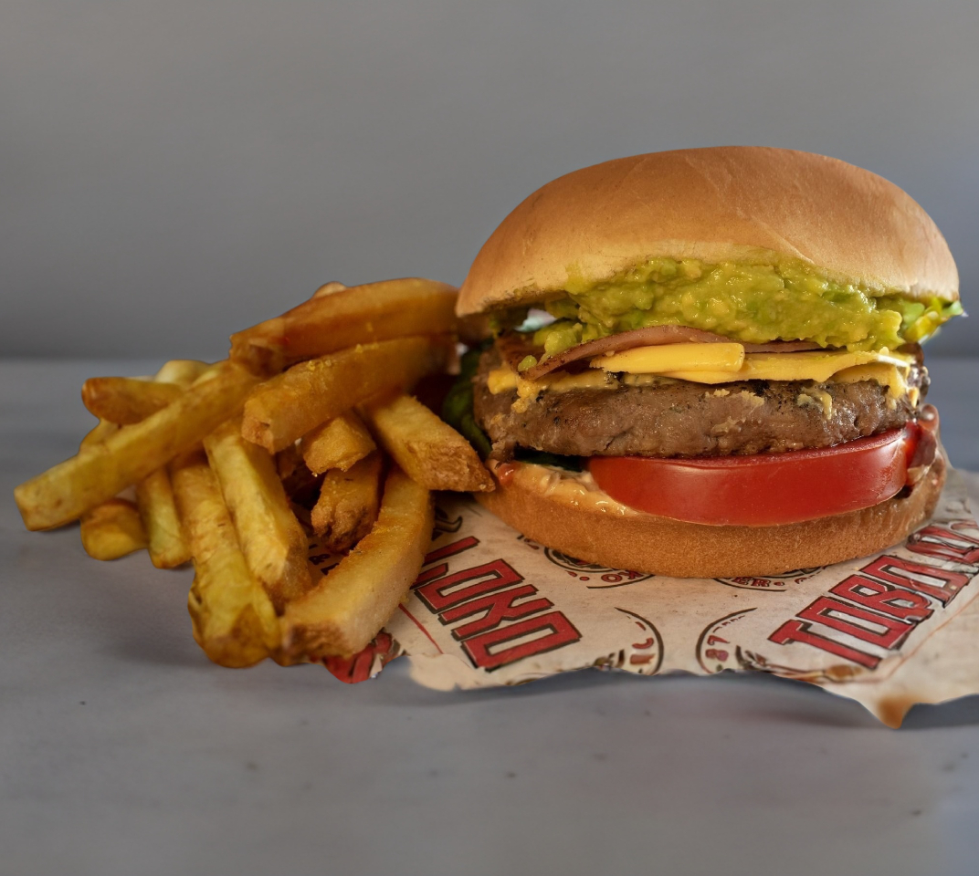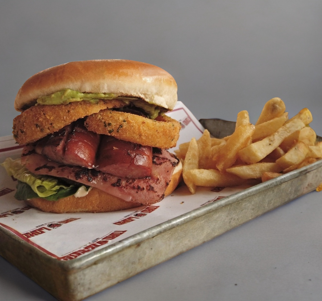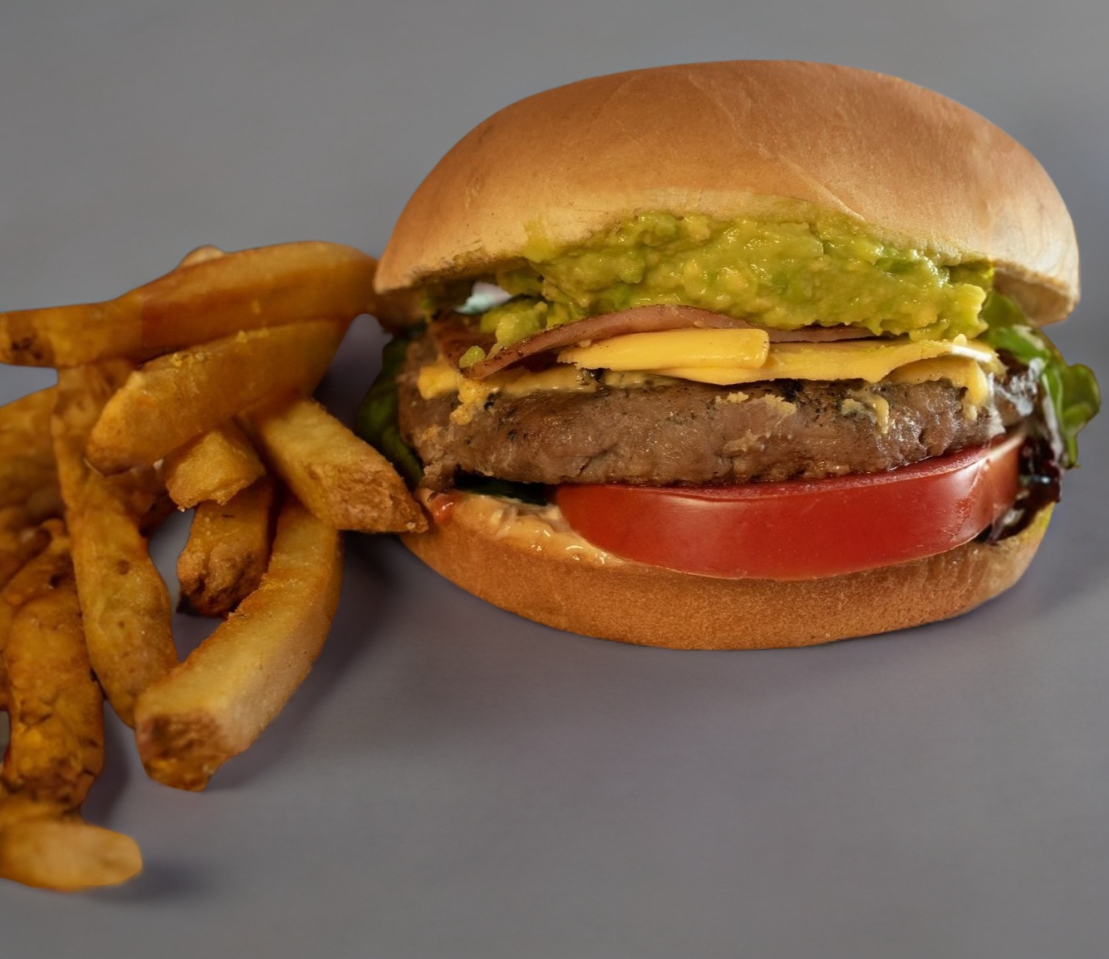 100 gr. de carne 100% de res, aderezo, lechuga, jamón, tomate y aguacate.