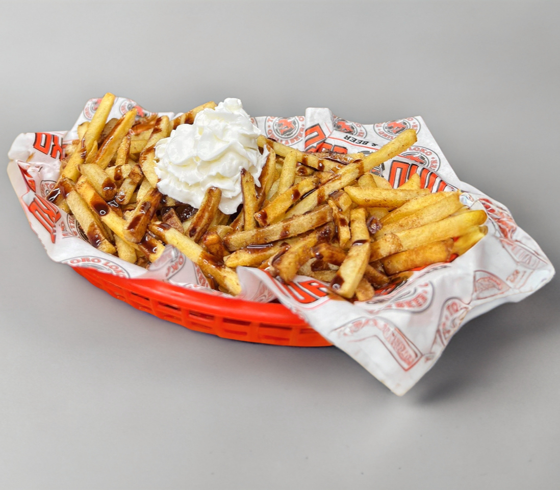 Papas fritas sazonadas, bañadas en chocolate, canela,azúcar y un toque de crema batida, dándole un sabor especial al paladar.