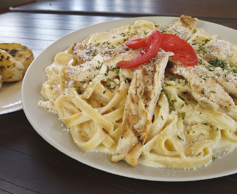 Pasta fresca servida con una deliciosa salsa alfredo. Acompañada con pan de ajo.